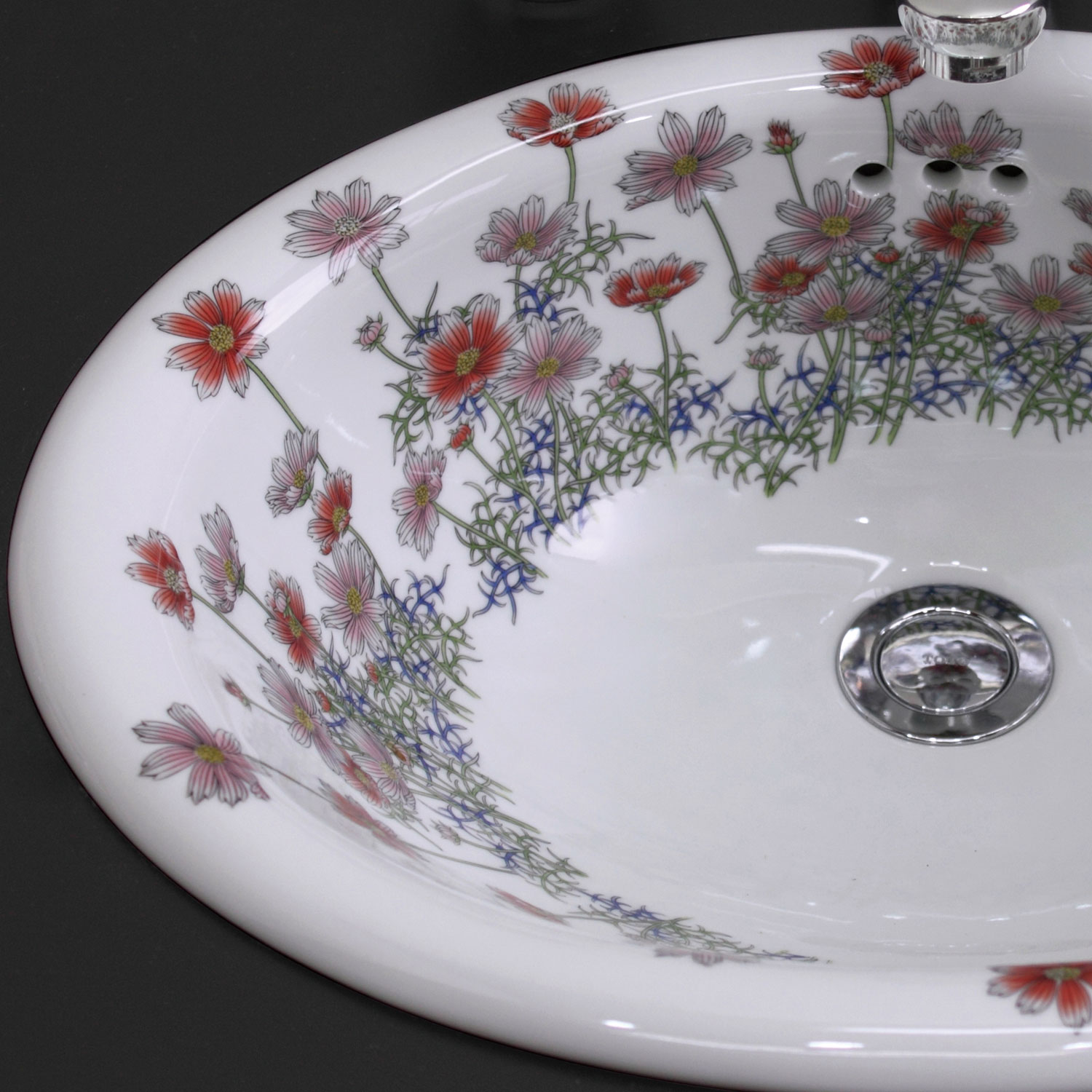 有田焼の楕円型洗面ボウル 色彩コスモス絵楕円型