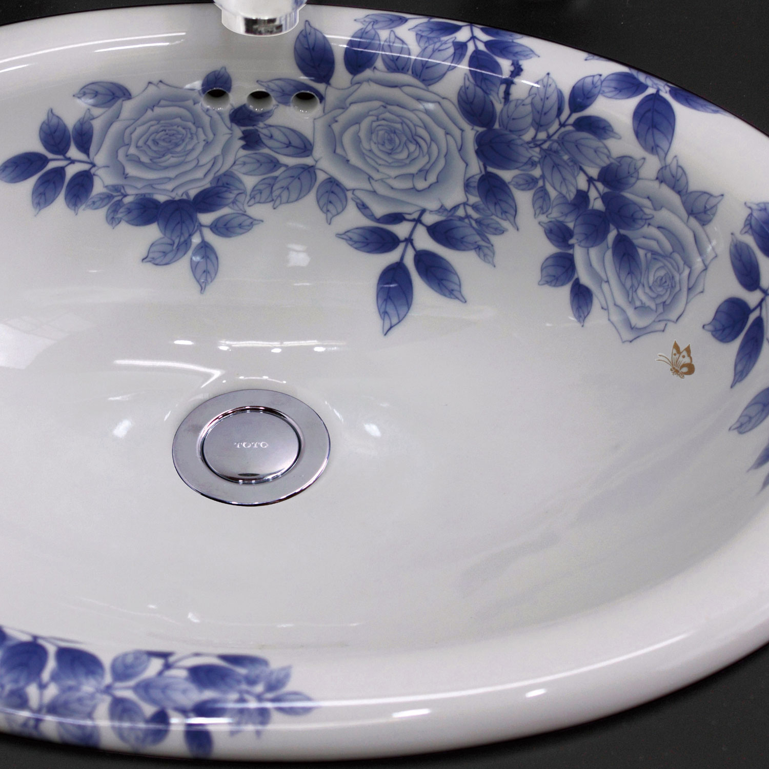 有田焼の斬新なデザインの楕円型洗面ボウルです。匠の技が光る逸品です。素敵な薔薇の絵柄が、清潔な洗面台を演出します。
