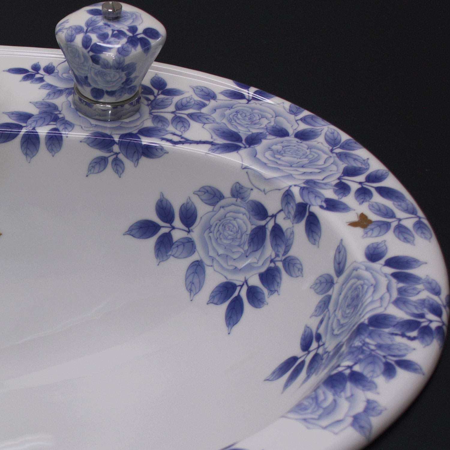 有田焼の楕円型洗面ボウル 600-染付薔薇絵楕円型