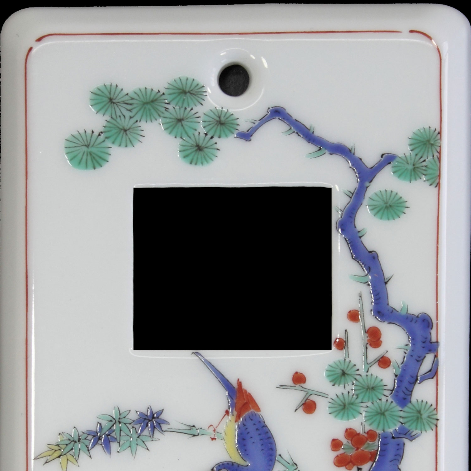 磁器のぬくもりとその絵付けの温かみが、お部屋にロマンスをもたらす有田焼のスイッチカバー(スイッチプレート)、色絵松竹梅花鳥絵が入りとてもおしゃれなカバーです。暗闇の中、スイッチを探しているとスイッチの周りを手で触ったりしませんか。プラスチック製などは手あかなどで汚れたり、摩擦などで表面が劣化したりしますが、磁器製ですと、汚れても拭くだけで綺麗になり、多少の摩擦で表面が、劣化する事もありませんので、お掃除も楽々、安心してお使いいただけます。