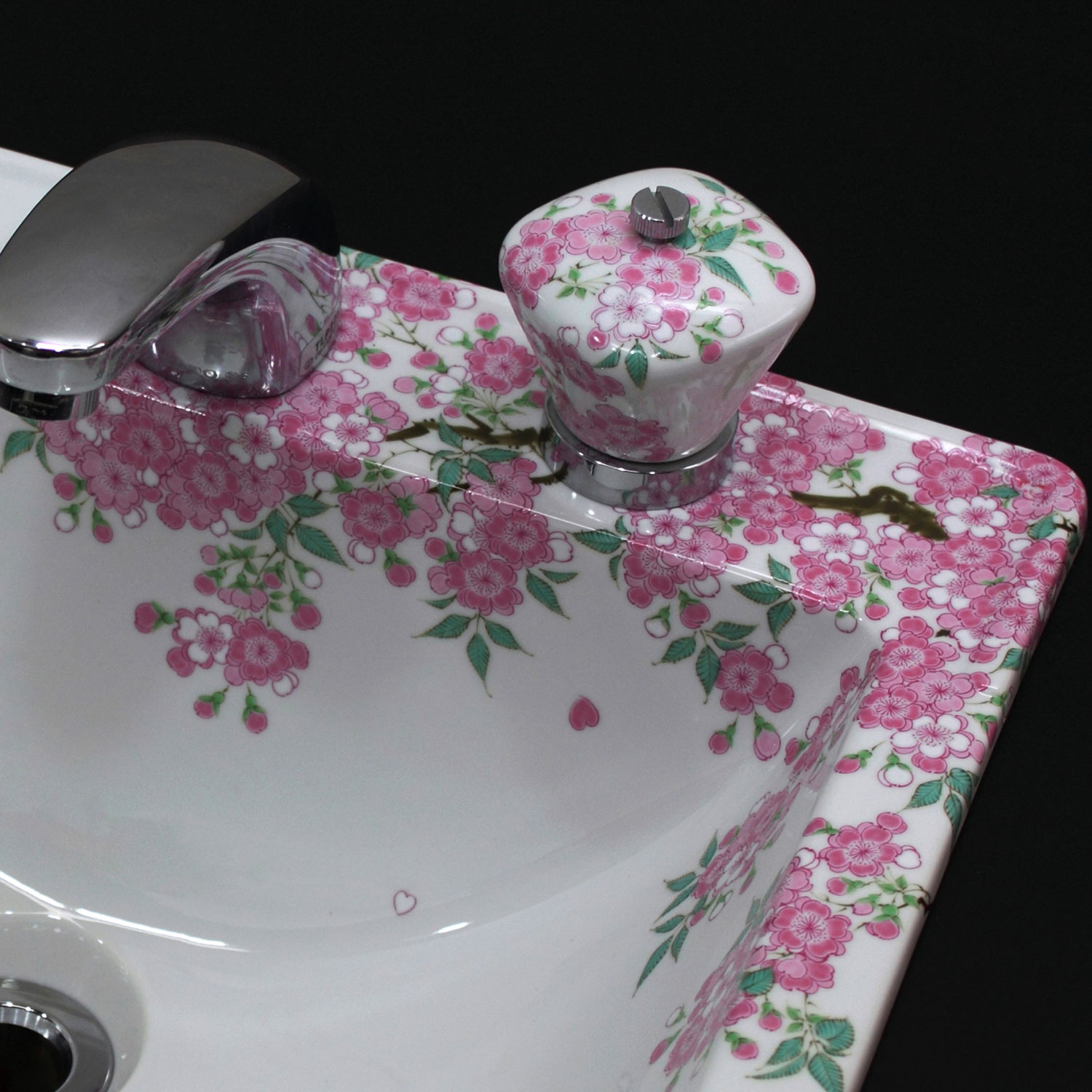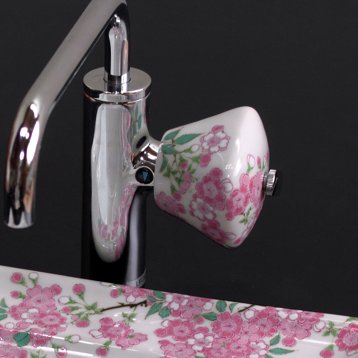 有田焼のおしゃれなデザインの桜絵柄水洗ハンドルです。有田デコの匠の技が光る逸品です。手洗い器や洗面ボウルと共にお使いいただくと更にゴージャスで、おしゃれな洗面台に