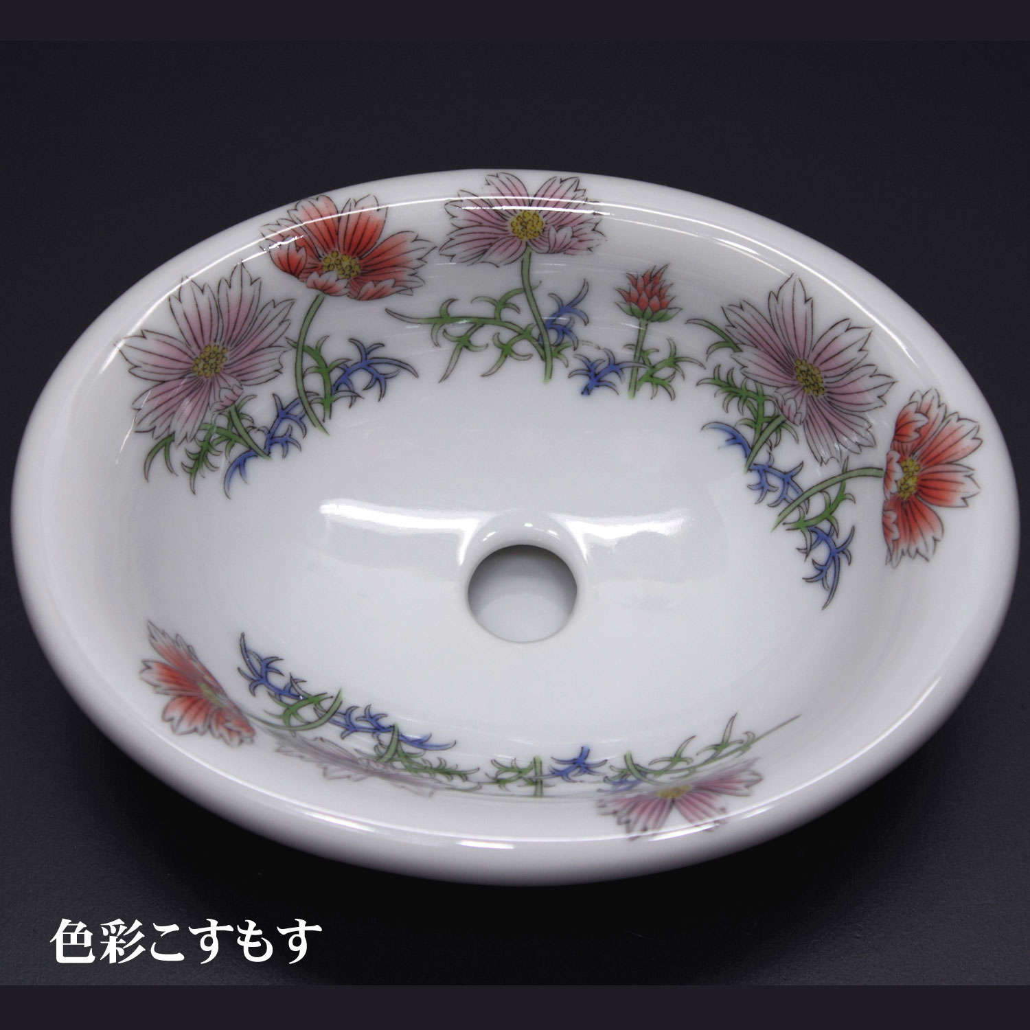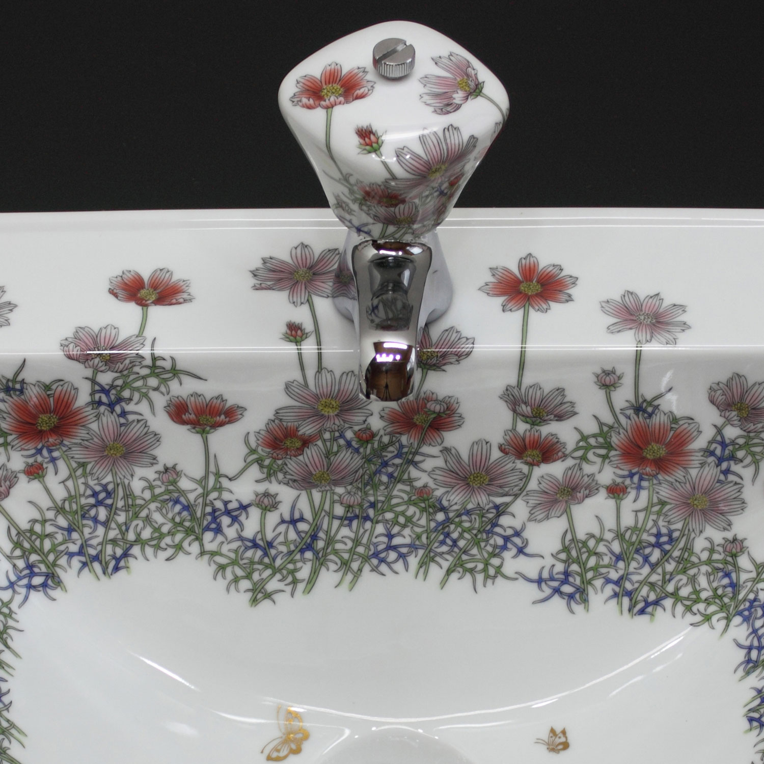 有田焼のおしゃれなデザインのコスモス柄水洗ハンドルです。有田デコの匠の技が光る逸品です。手洗い器や洗面ボウルと共にお使いいただくと更にゴージャスで、おしゃれな洗面台に