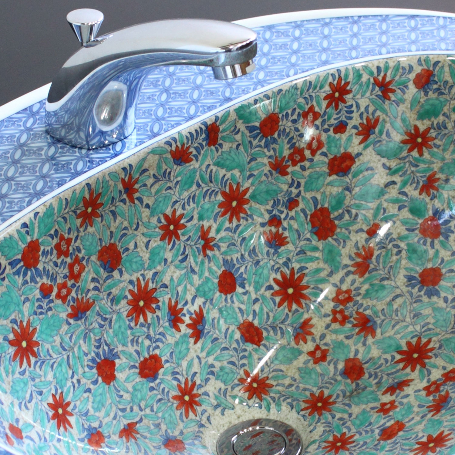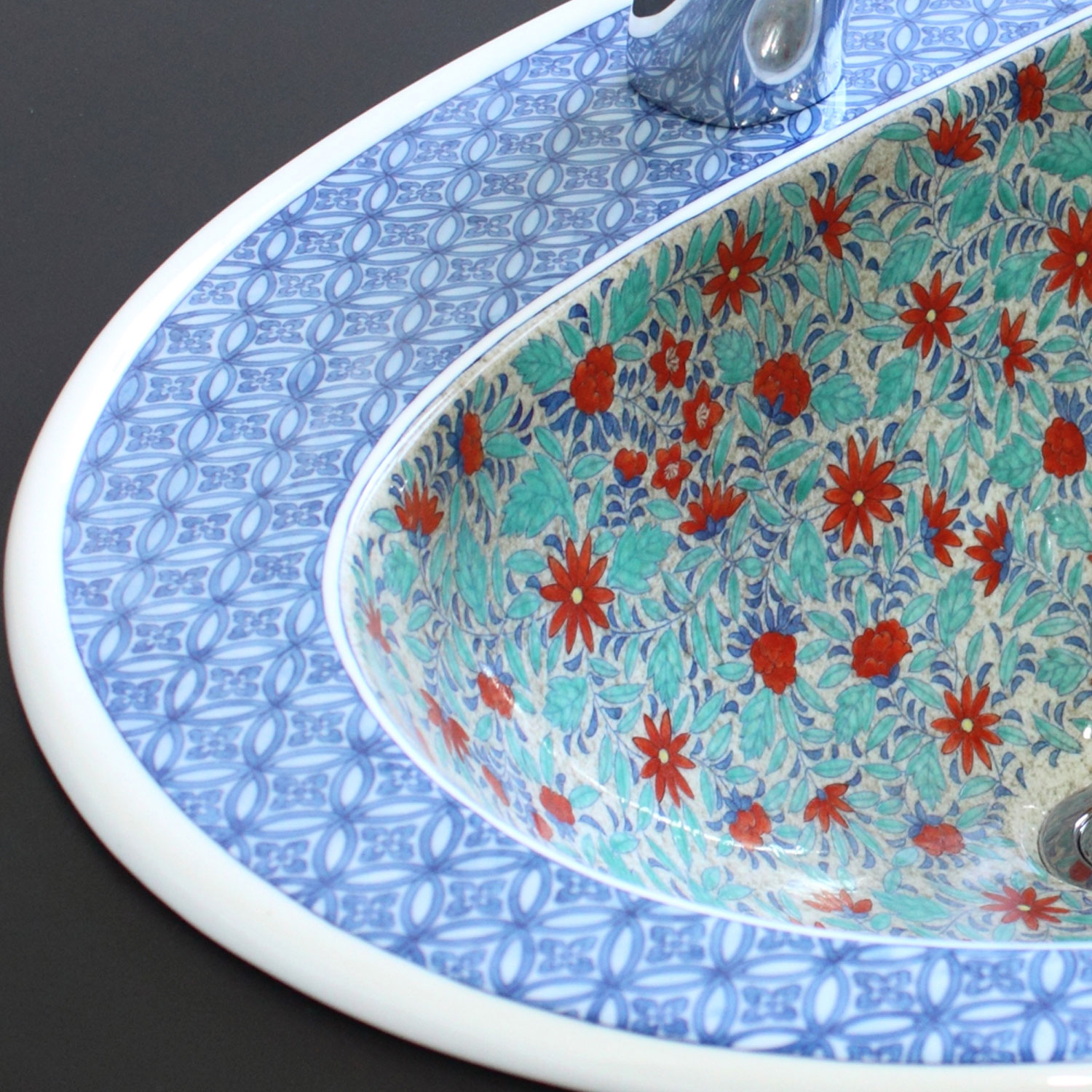 有田焼の伝統様式、色鍋島吹き墨更紗絵楕円型洗面ボウル、洗面ボール、和・洋式問わず更紗と薄墨の豪華で深みの有る職人の技で 焼き上げ た洗面ボウルの最高級品。
