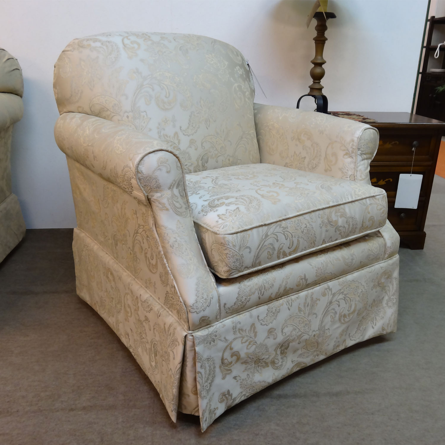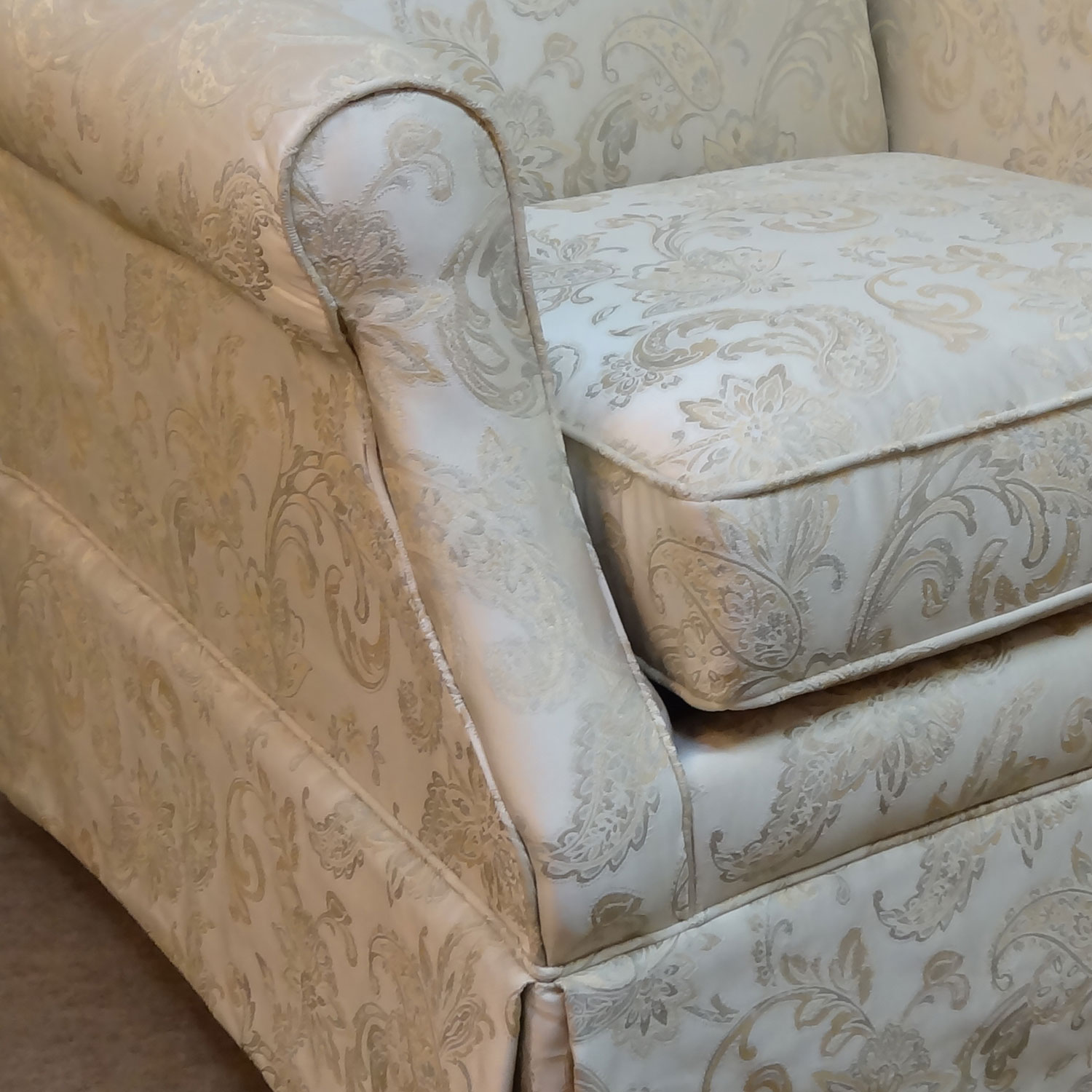 アメリカ製の一人掛け輸入ソファーです。座り心地も抜群で、ファブリックもとても強いものを使用しています。エレガントな織り柄が、とてもきれいなファブリックです。
