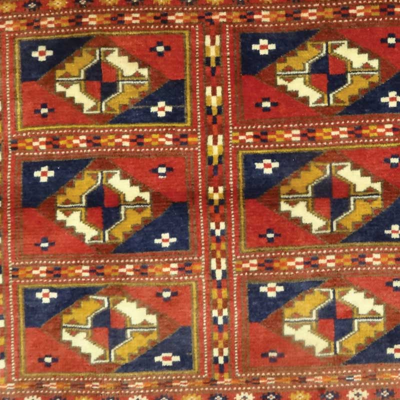 また、トルクメン族の手織りする絨毯の紋様には、その特色が良く表現されていています。日本でいえば家紋のように、各部族ごとはもちろん更に細かく各氏族ごとにはっきり区別できるような特徴のあるギュルと呼ばれる独特の文様をもっています。トルクメン族の生活する場所