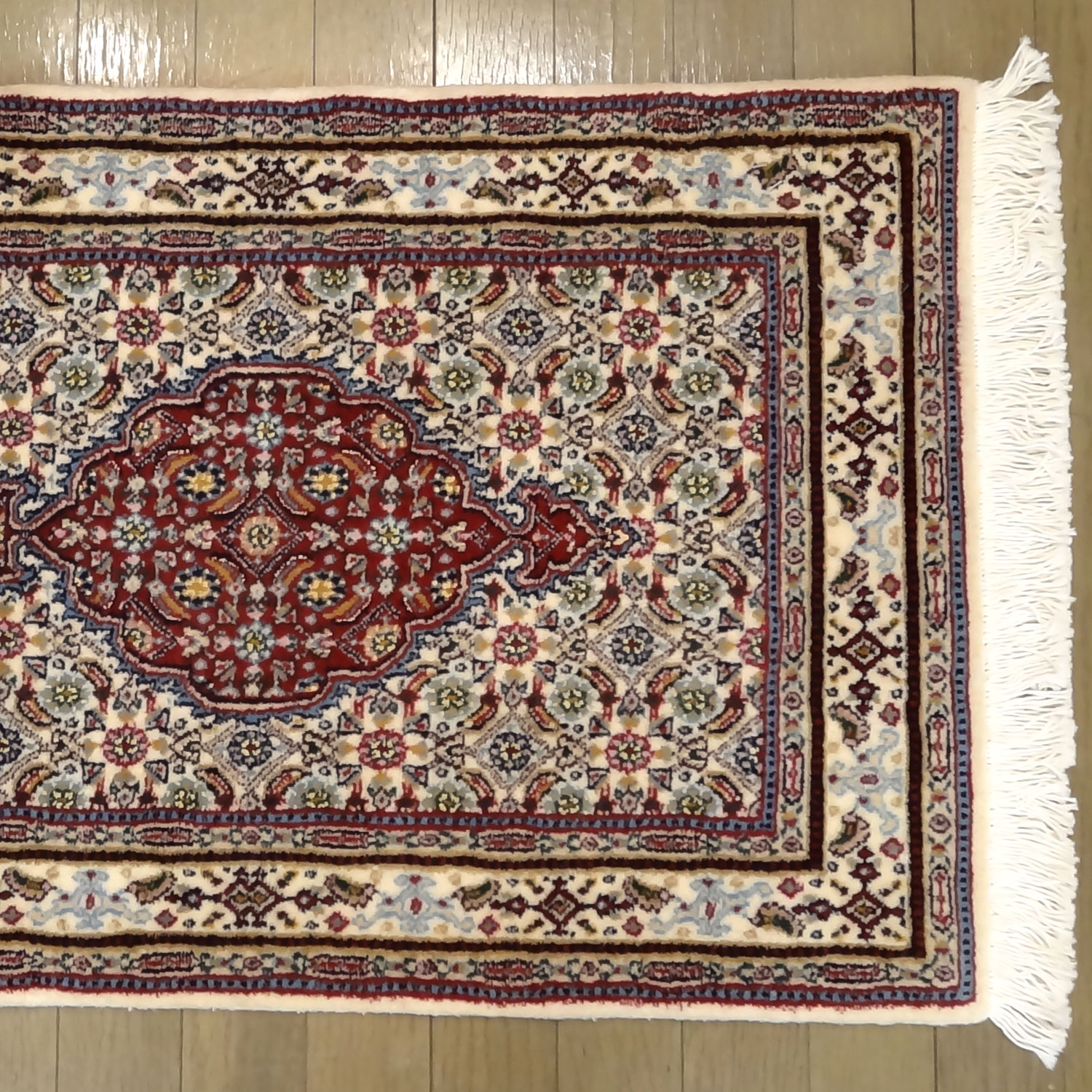 ペルシャ絨毯・ムード、こちらの絨毯は、ムード・マヒと呼ばれベージュ色に薄い赤色や青色のニュアンスが用いられ、星形のメダリオンが特徴的です。クラシックな伝統的な柄で、価格もリーズナブルで人気の絨毯です。