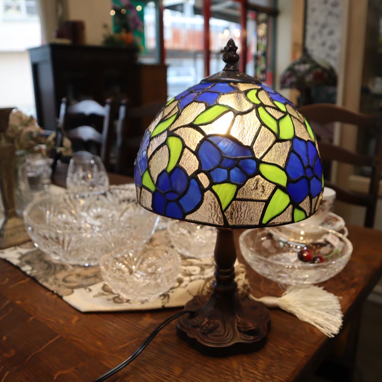 透明の波ガラスに鮮やかなブルーの花、シンプルな色合いで、場所を選ばずにどこでも飾っていただけます。おすすめのステンドグラスランプです。