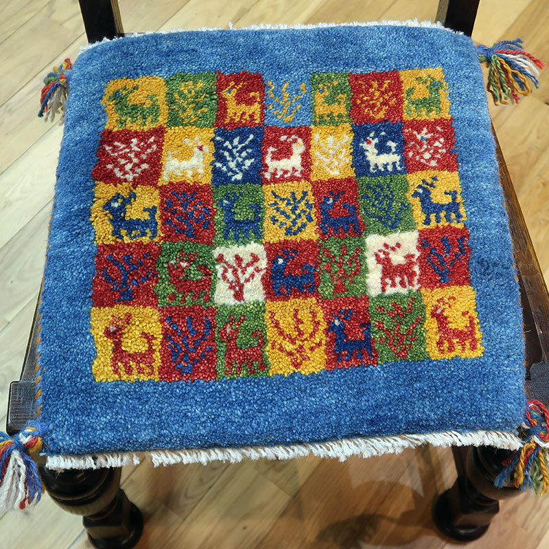 ペルシャ絨毯の中でも毛足が長いギャッベ(ギャベ)AB-PT26679。こちらのサイズは、ミニ座布団サイズで、ダイニングチェアや車のシートの上に敷いてお使いいただけるふかふかのギャッベ(ギャベ)絨毯です。