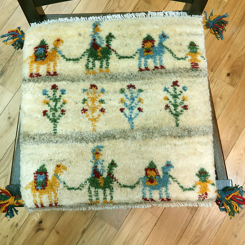 ペルシャ絨毯の中でも毛足が長いギャッペ(ギャベ)AB-T1465。こちらのサイズは、ミニ座布団サイズで、ダイニングチェアや車のシートの上に敷いてお使いいただけるふかふかのギャッペ(ギャベ)絨毯です。