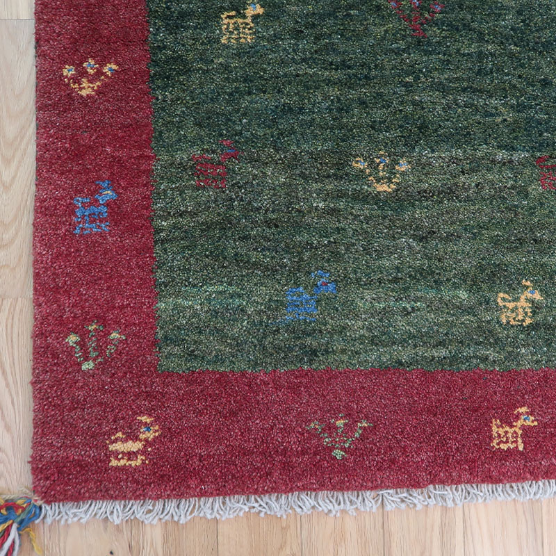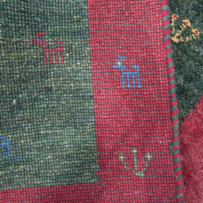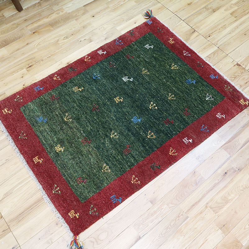 ペルシャ絨毯の中でも毛足が長いグリーン基調のギャッベリビングサイズ(小)。