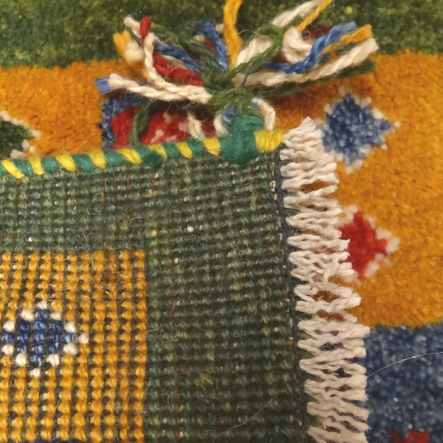 ペルシャ絨毯の中でも毛足が長いギャッペ(ギャベ)。こちらのサイズは、ミニ座布団サイズで、ダイニングチェアや車のシートの上に敷いてお使いいただけるふかふかのギャッペ(ギャベ)絨毯です。