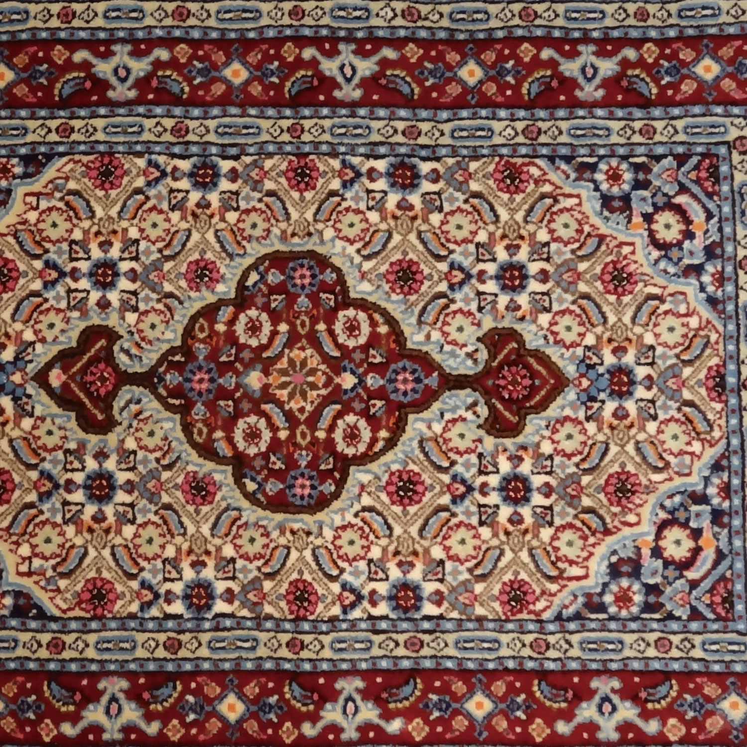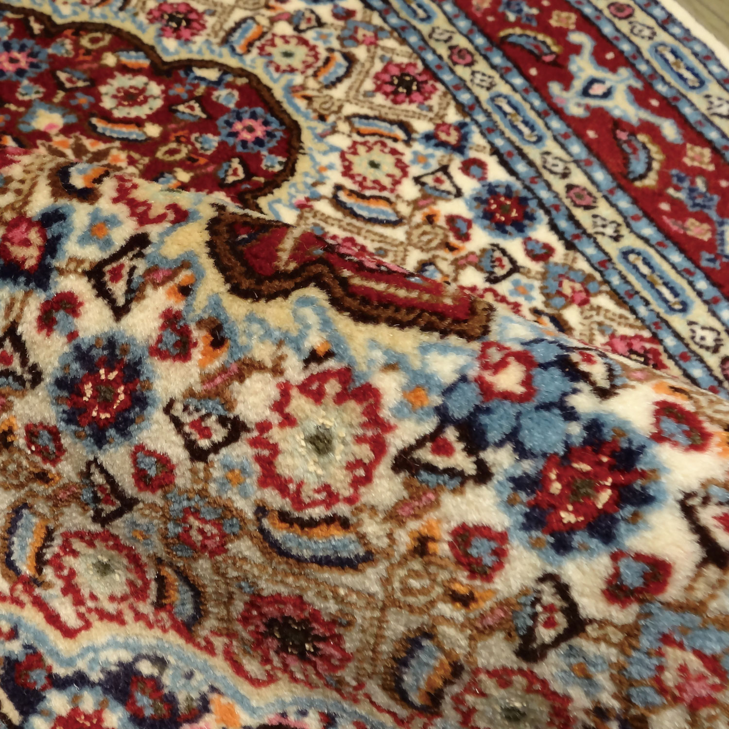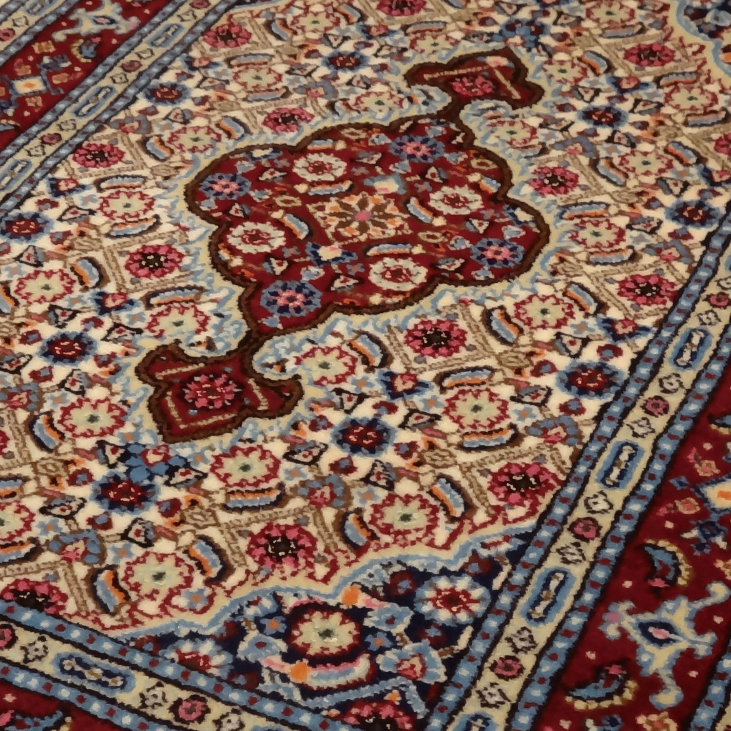 ペルシャ絨毯のムード産の玄関マットは、ライトブルー、ワインレッド、、グリーン等、沢山のの色糸を使って細かい模様に仕上げていますので汚れも目立ちにくく、全体的にはワインレッド系のイメージで、インテリアに重厚感を与えインテリア空間をゴージャスに演出いたします。