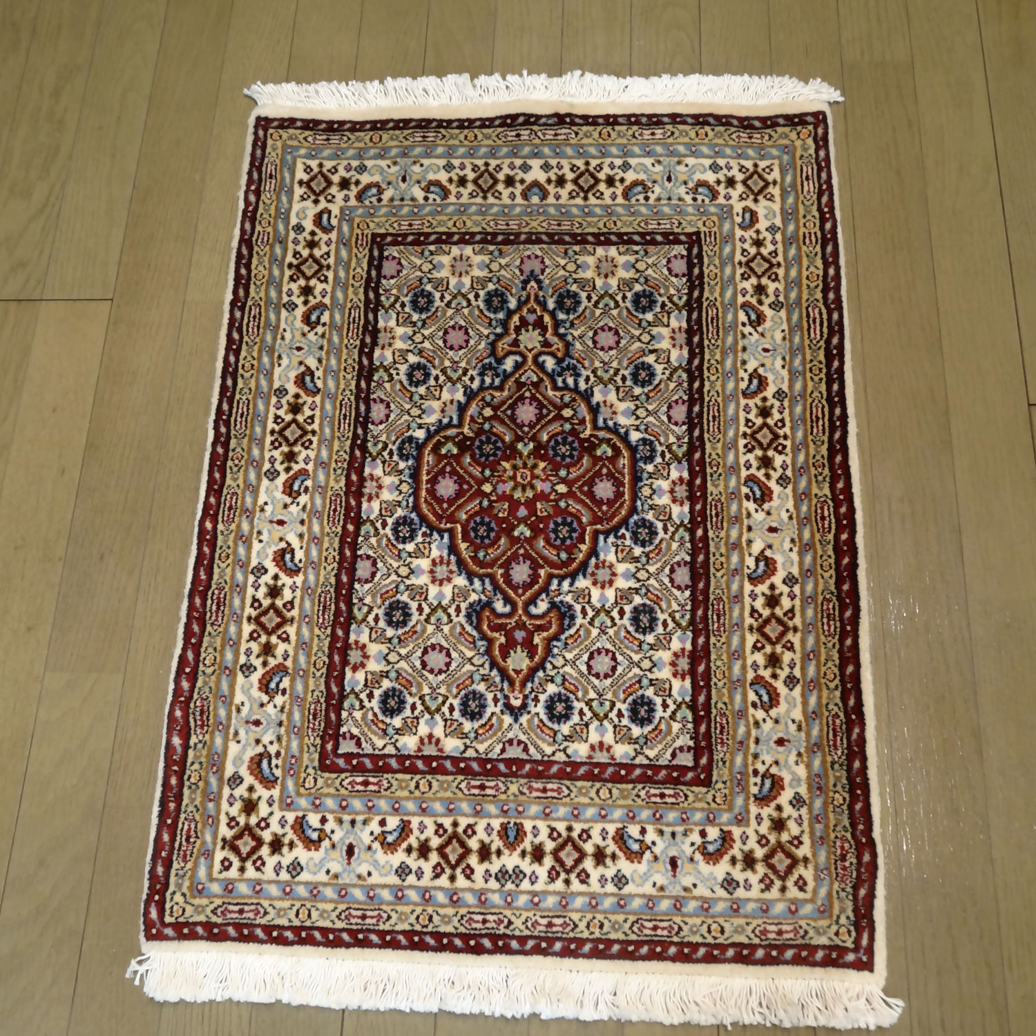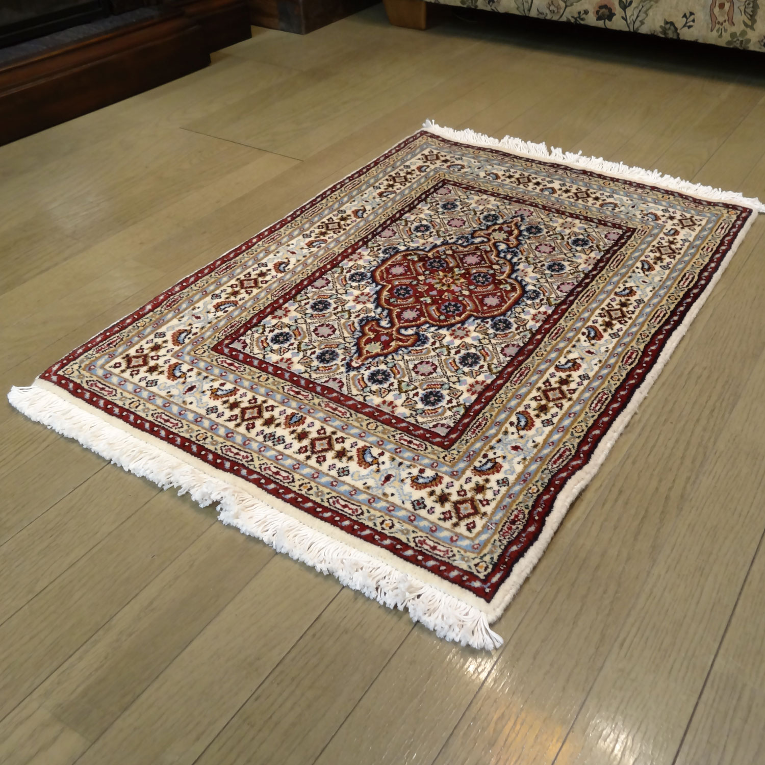 ペルシャ絨毯のムード産の玄関マットは、ライトブルー、ワインレッド、、グリーン等、沢山のの色糸を使って細かい模様に仕上げていますので汚れも目立ちにくく、ワインレットの細いボーダーが、絨毯を引き締め、全体的には淡いベージュ系のイメージで、インテリアに格調を与えインテリア空間をエレガントに演出いたします。