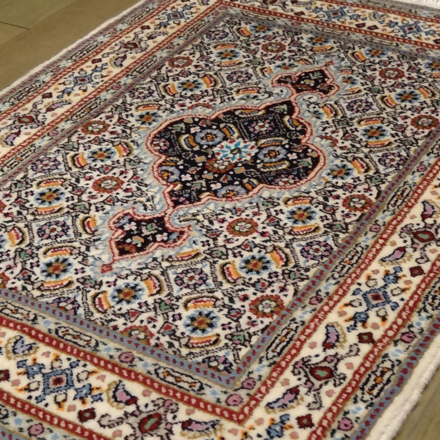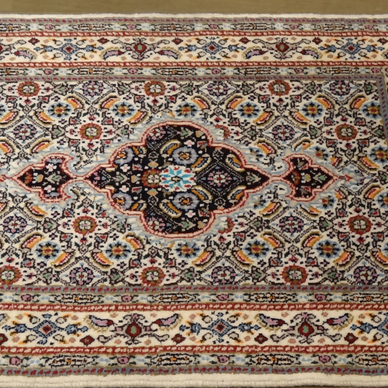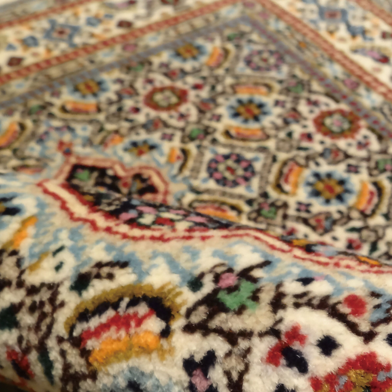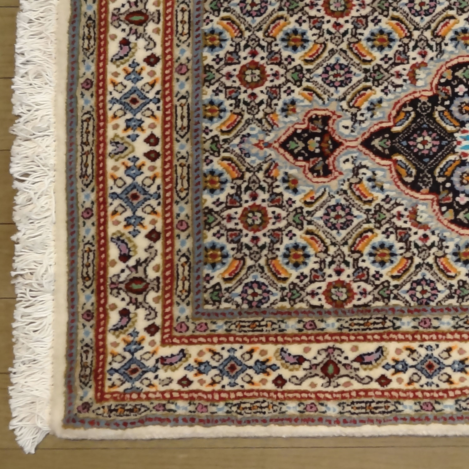 ペルシャ絨毯のムード産の玄関マットは、ライトブルー、ワインレッド、、グリーン等、沢山のの色糸を使って細かい模様に仕上げていますので汚れも目立ちにくく、全体的にはうすいブルー系のイメージで、バーダーには、ベージュの糸を使い、インテリアに優しさを与え、空間をエレガントに演出いたします。