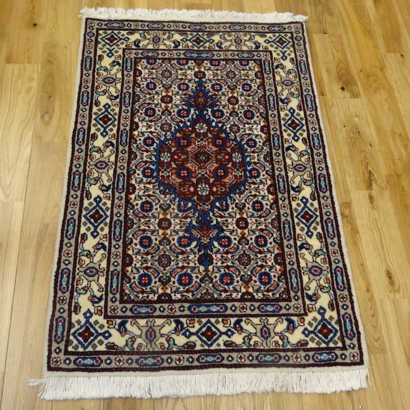ペルシャ絨毯のムード産の玄関マットは、ライトブルー、ワインレッド、、グリーン等、沢山のの色糸を使って細かい模様に仕上げていますので汚れも目立ちにくく、珍しく明るい配色の手織り絨毯です。全体的には淡いライトブルーが基調のとても柄の細かい絨毯です。サイズとしては、玄関フロアーにベストマッチ。