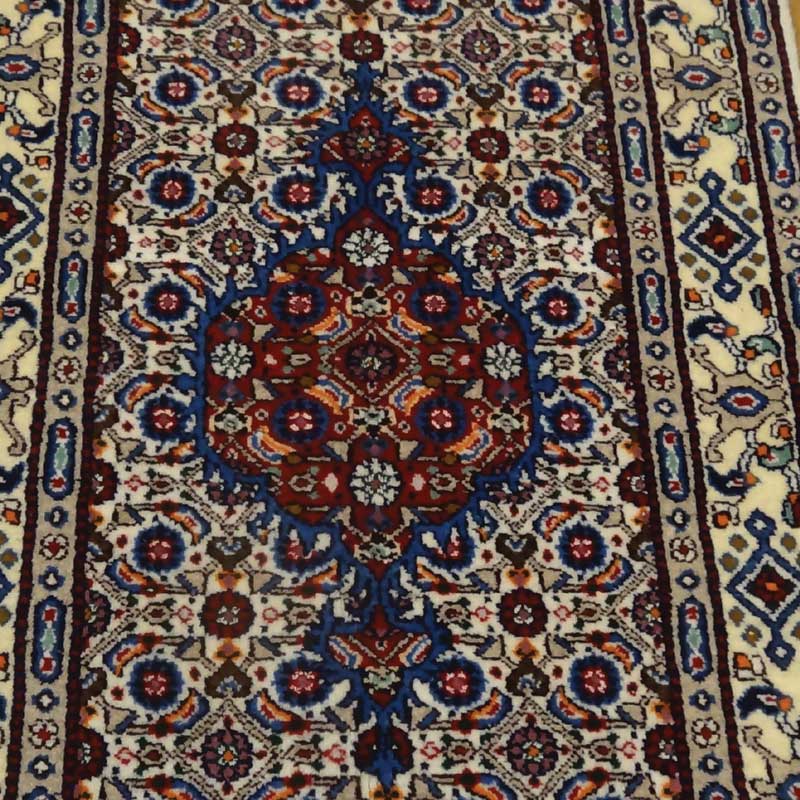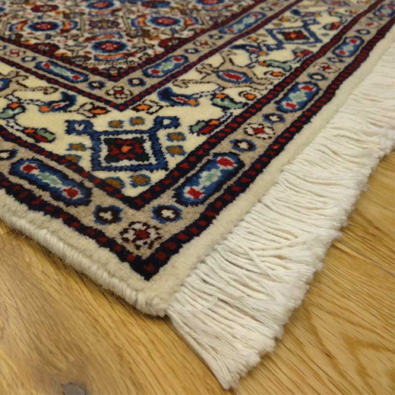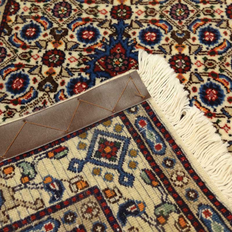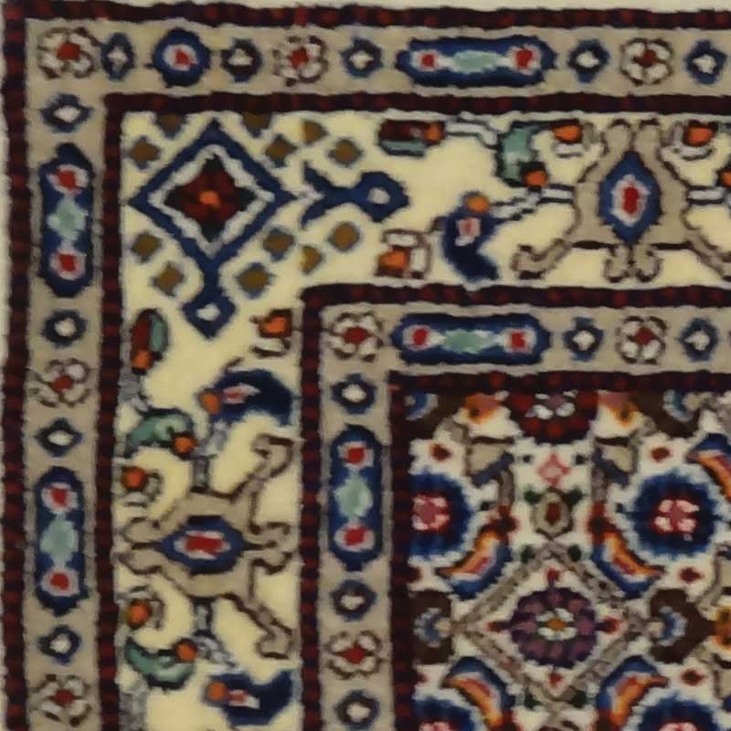 絨毯にはしばしばヘラティ文様(ヘラティ文様の基本形は、菱形に配置された4枚の葉に花があしらわれている。マヒ(魚)文様とも呼ばれている。)が見られ、絨毯中央にメダリオンがある場合とない場合の両方のパターンがあります。時折、ムードの絨毯は、ベージュ色に薄い赤色や青色の配色が用いられ、星形のメダリオンが特徴的なムード•マヒとバクティアリ絨毯を彷彿とさせる、曲線の庭園がモチーフとして描かれたムード•ガーデンに分類されます。