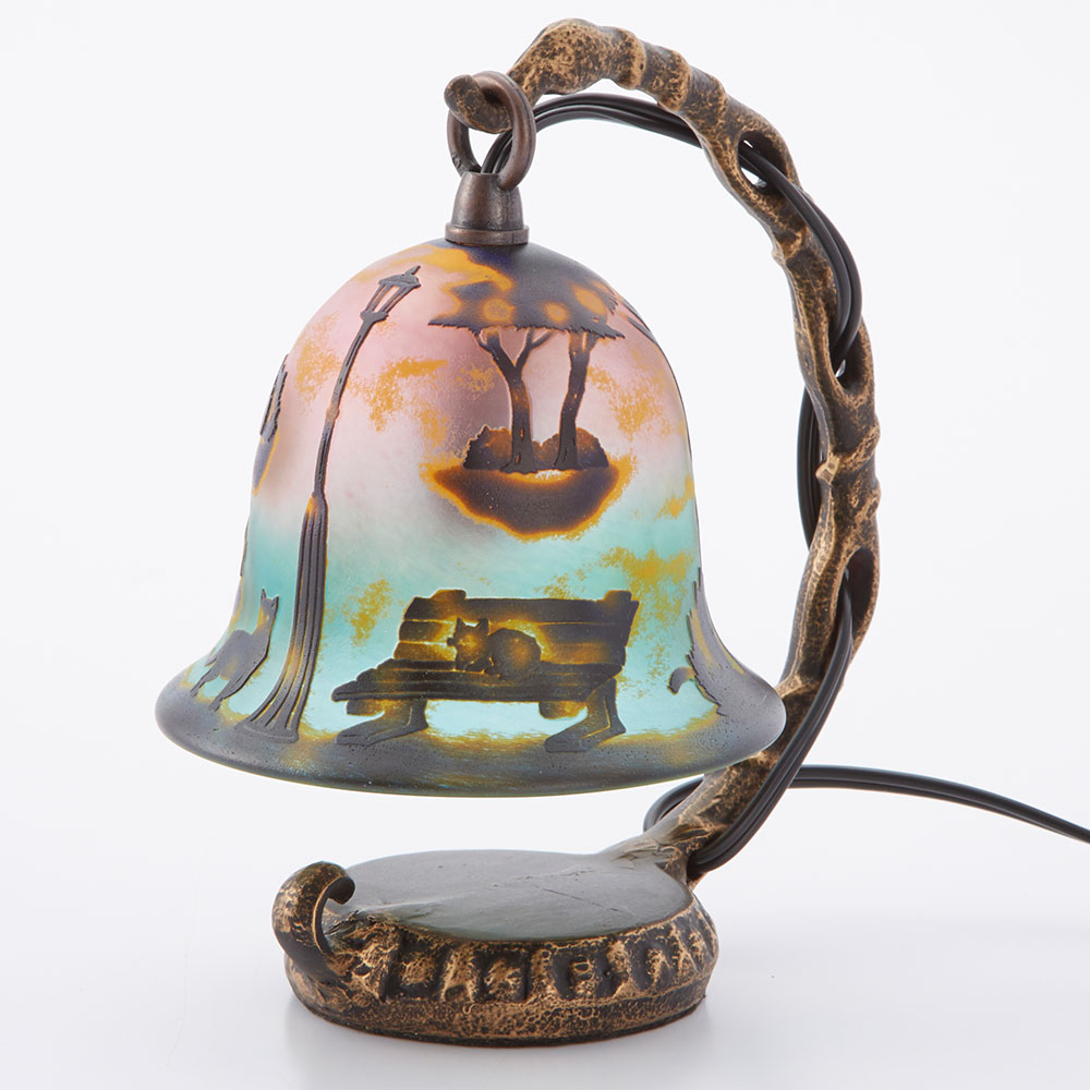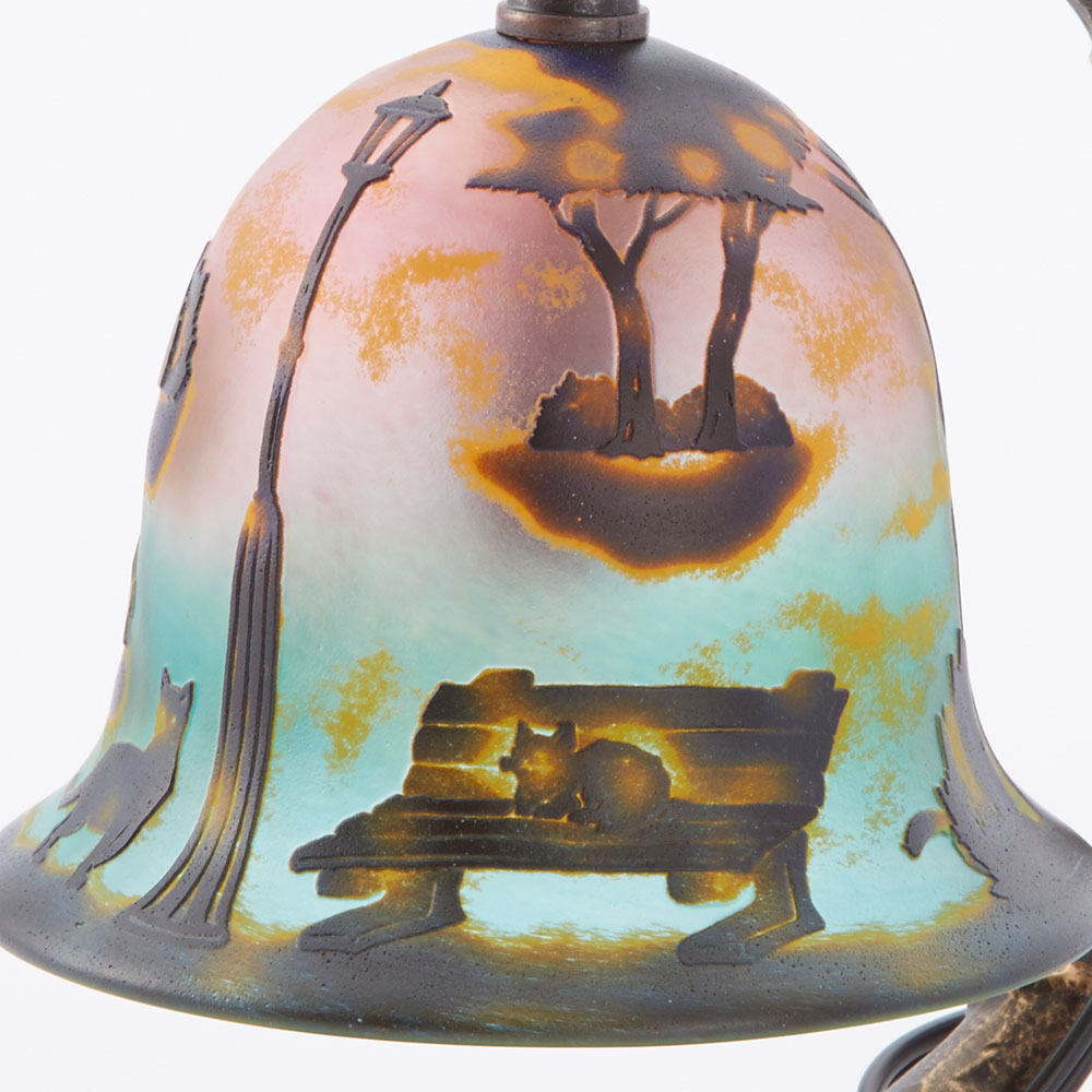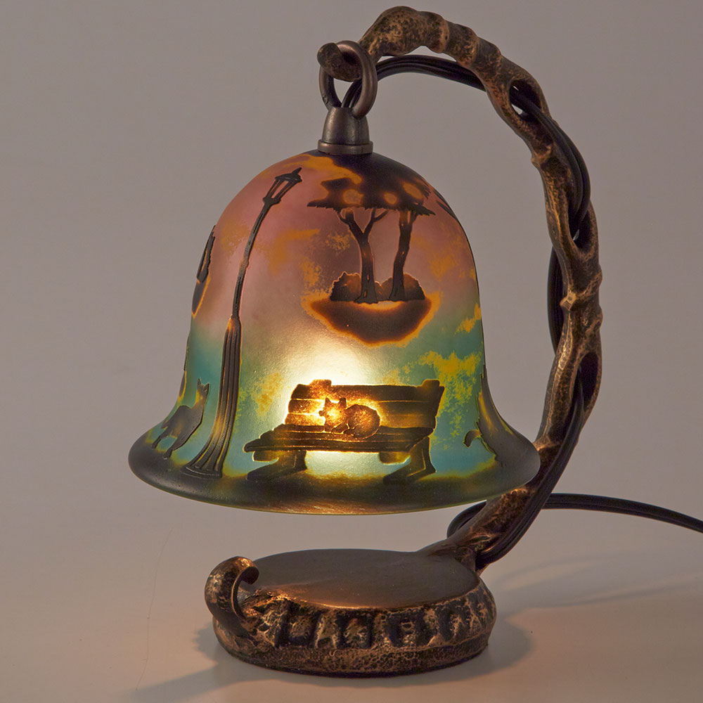 猫をモチーフにして制作された宙吹きガラスのシェードを使ったミニランプです。ガラス工芸作家、高城健治・高城美和子の芸術的な作品です。ロマンチックなデザインです。