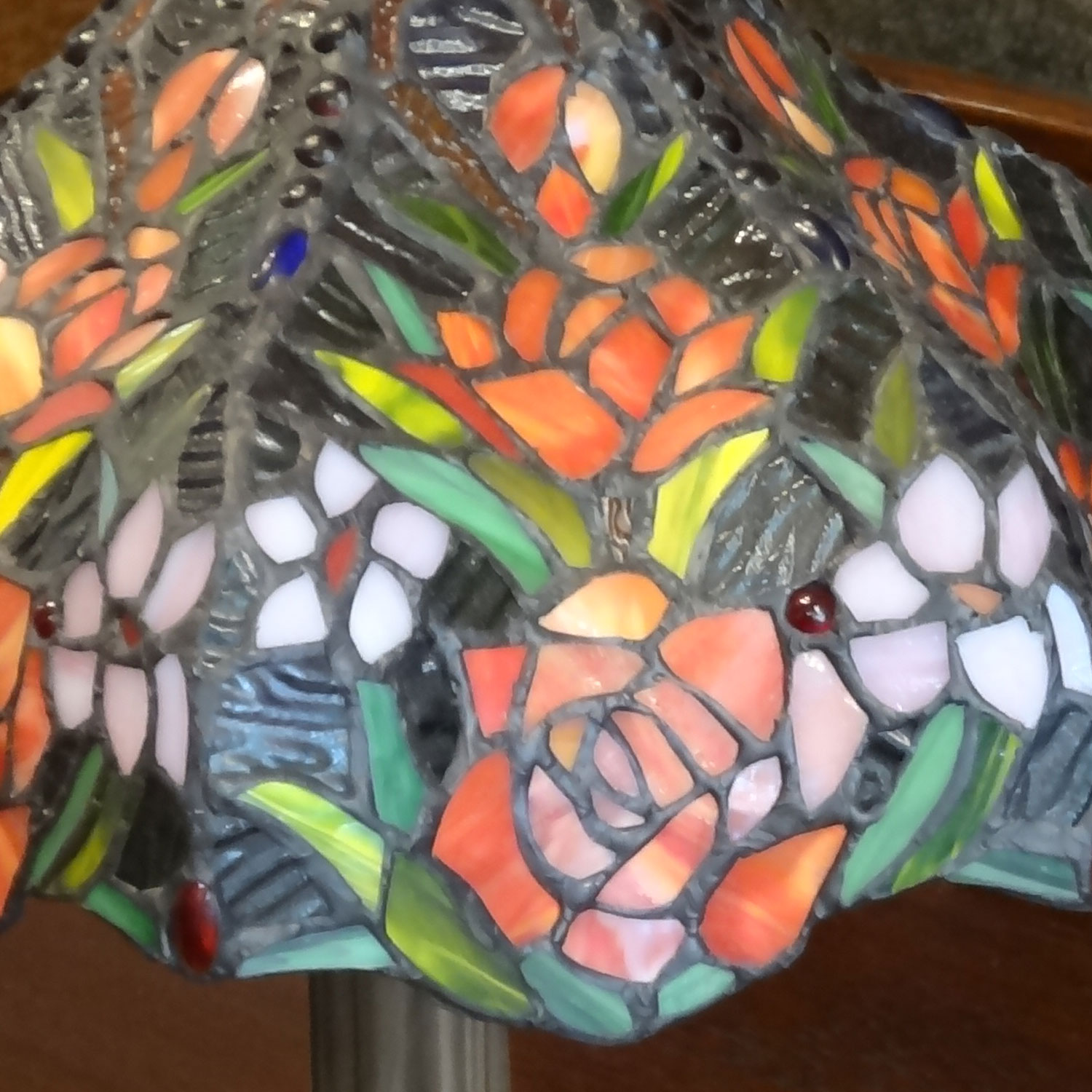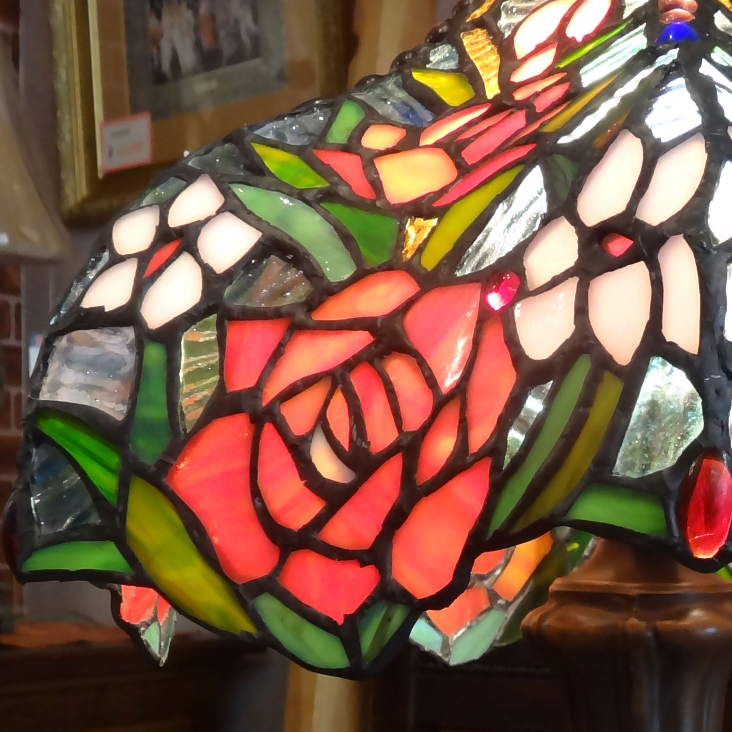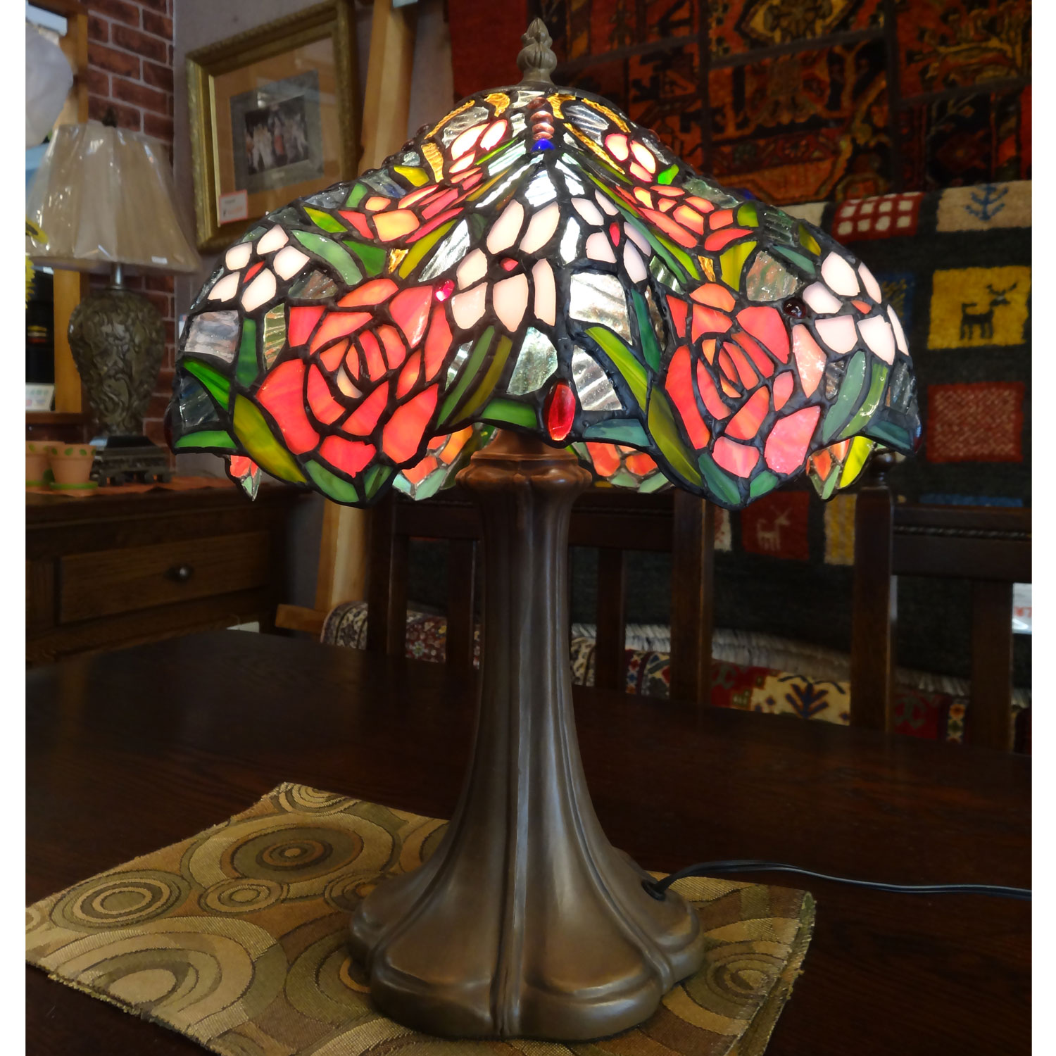 アンティークな雰囲気の薔薇をちりばめたステンドグラステーブルスタンド。灯りをつけると、所々に取り入れたナギットガラスがキラキラ輝いてとっても綺麗です。写真では分かりにくいのですが、シェードは上から見ると星のようなコンペイトウのような形になっています。お洒落なランプです。