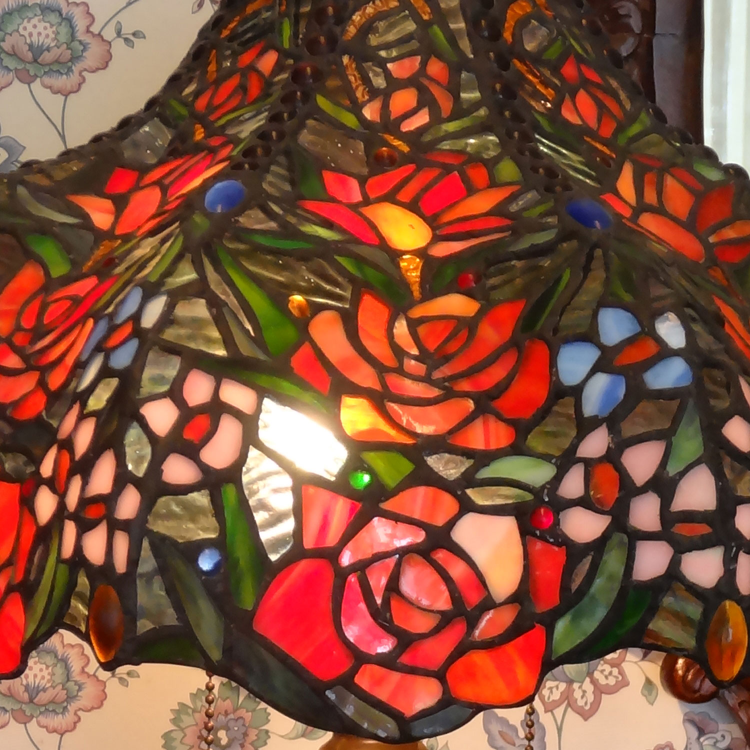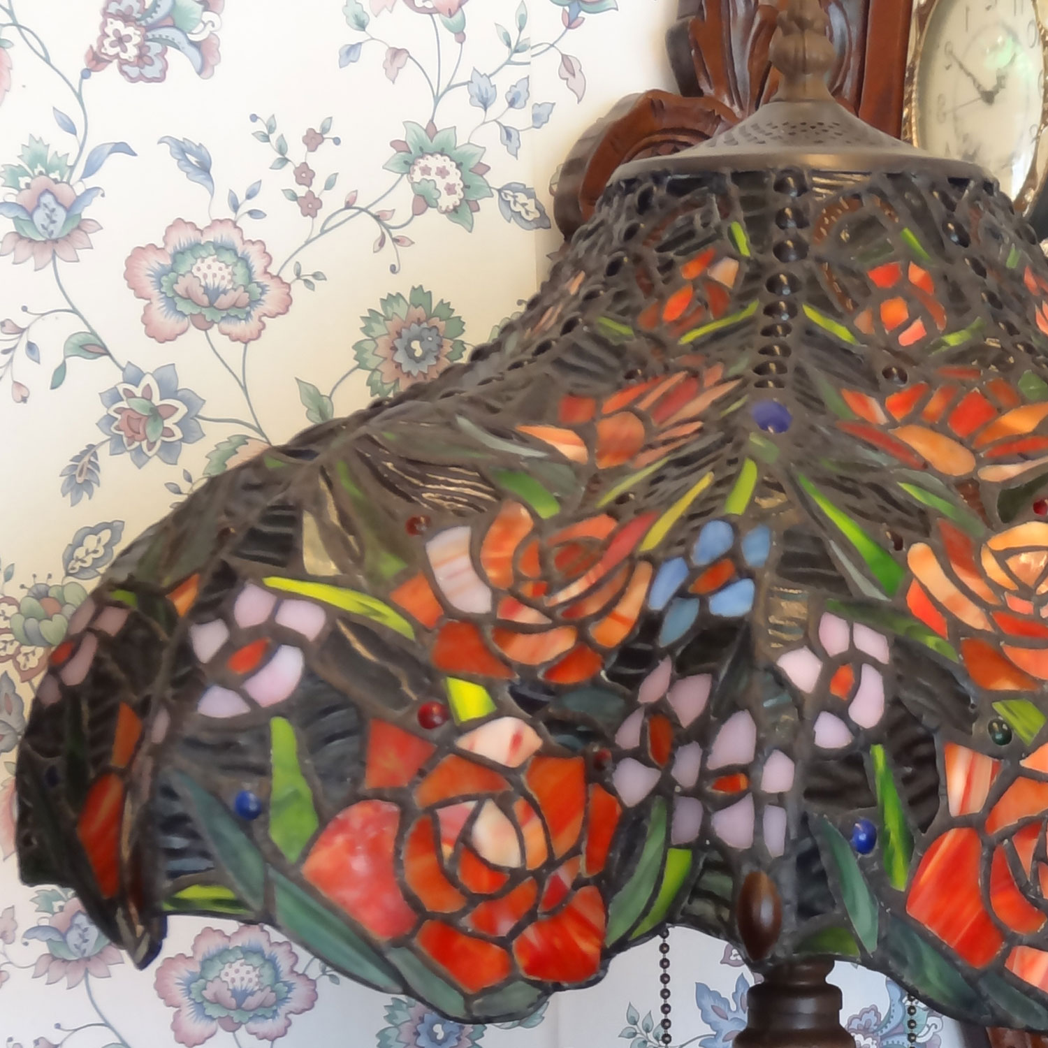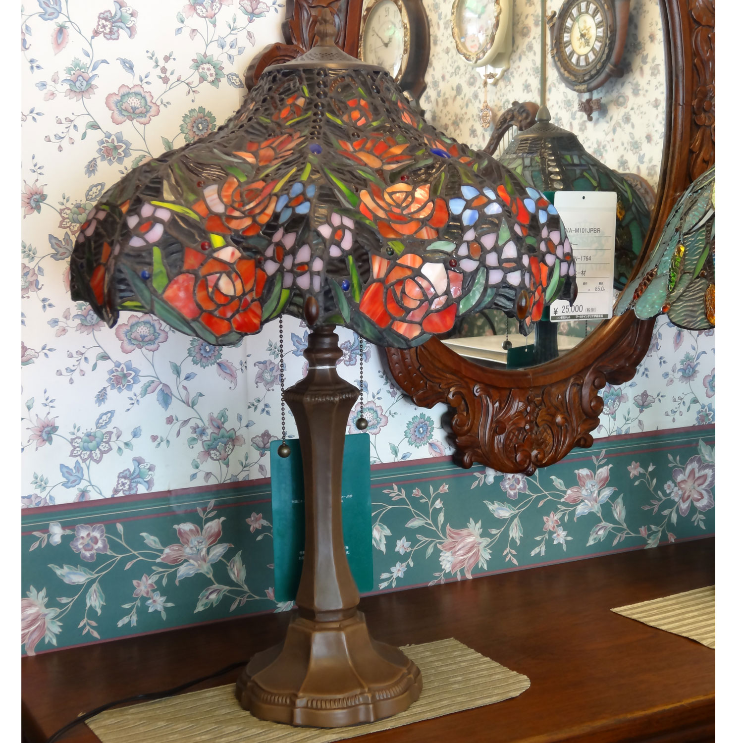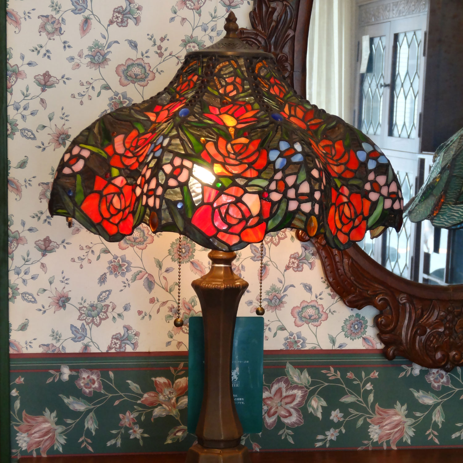アンティークな雰囲気の薔薇をちりばめた大型のステンドグラステーブルスタンド。