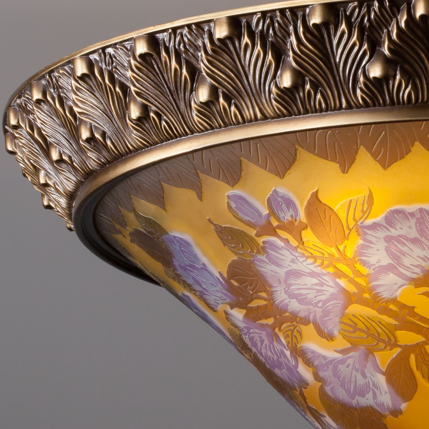 GALLE COLLECTIONのシリーズは、単なるガレランプの模倣ではなく、そのガラスの製法と作風を生かしつつ、これをクラシックスタイルのメタルフレームと組み合わせることで生み出された、全く新しいデザインの照明器具です。