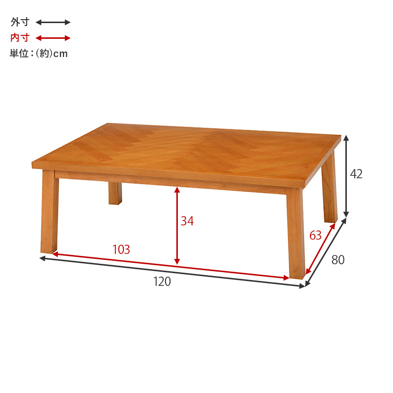 天然木を組み合わせたヘリンボーン柄の天板が120cm幅のおしゃれなリビングこたつテーブル。