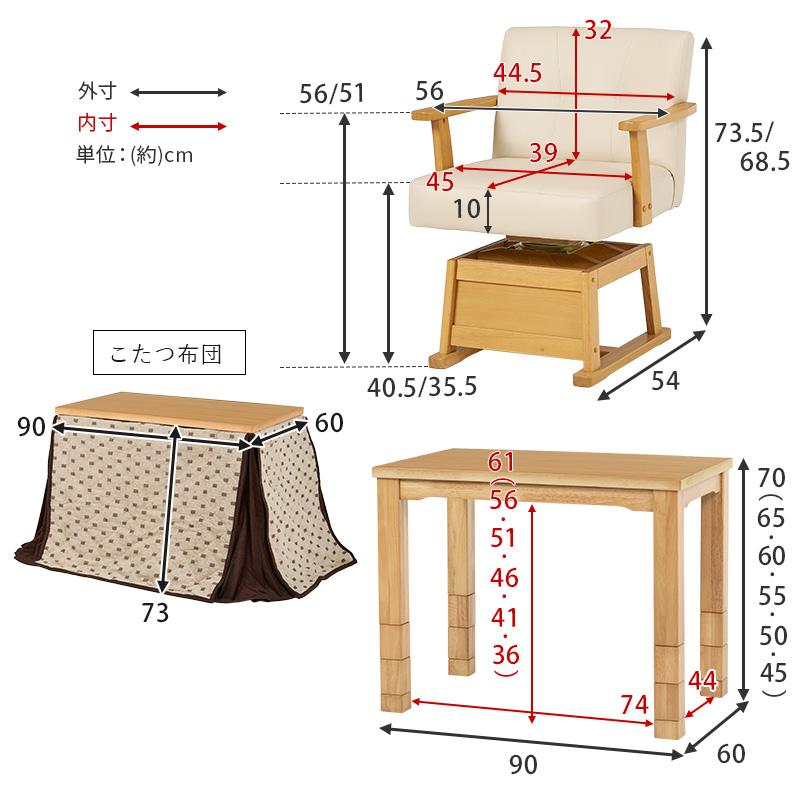 - こたつ:<天板>天然木化粧繊維板<脚部>ラバーウッド チェア:<木部>ラバーウッド<張地>合成皮革
