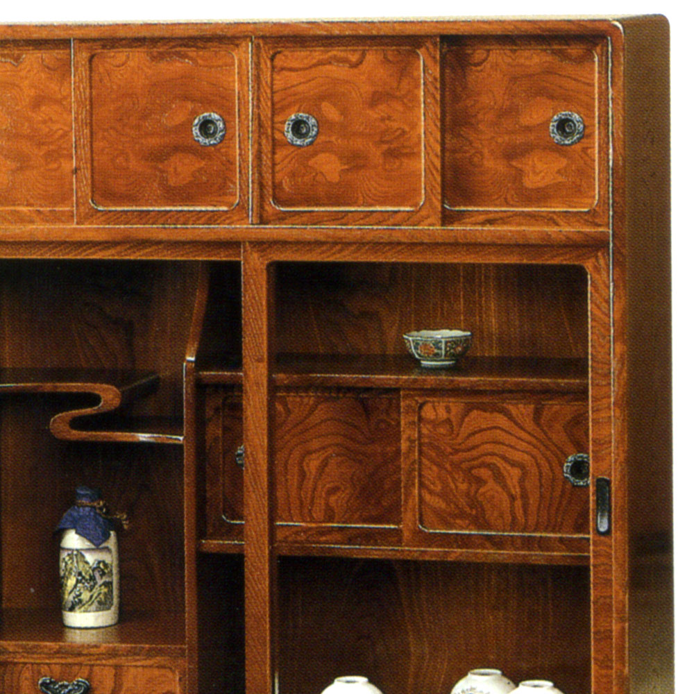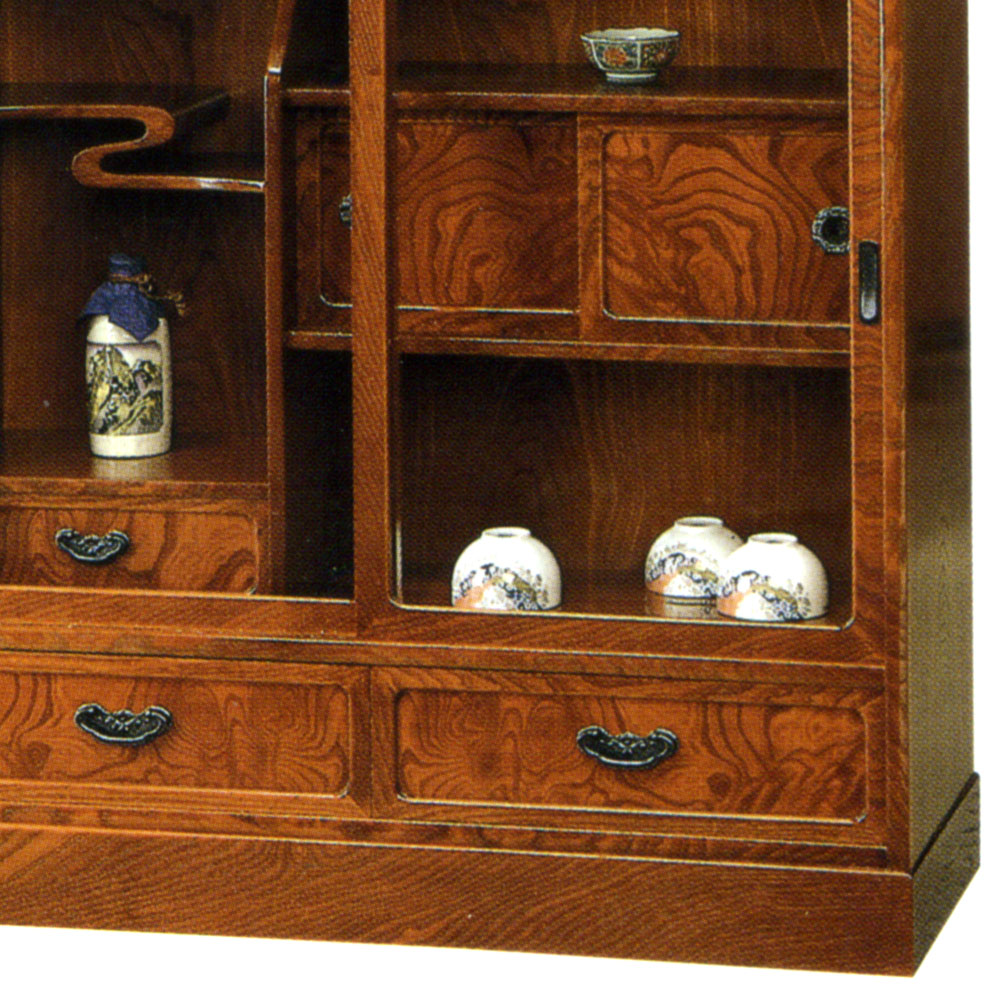 ケヤキ材の綺麗な木目を生かし、匠の技が、光る逸品です。こちらの和茶棚は、ケヤキの天然杢を使用したガラス部分を広く取り、飾る収納を重視しました。薄型タイプの和茶棚です。