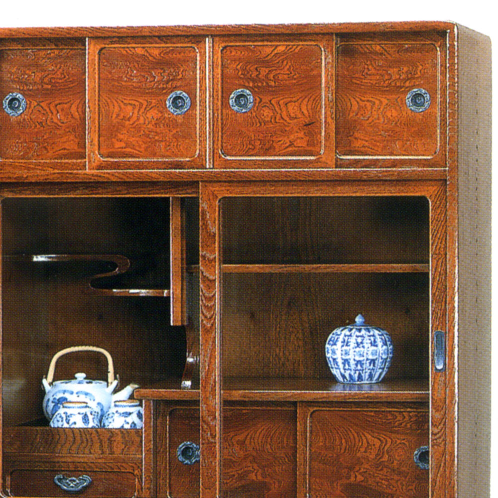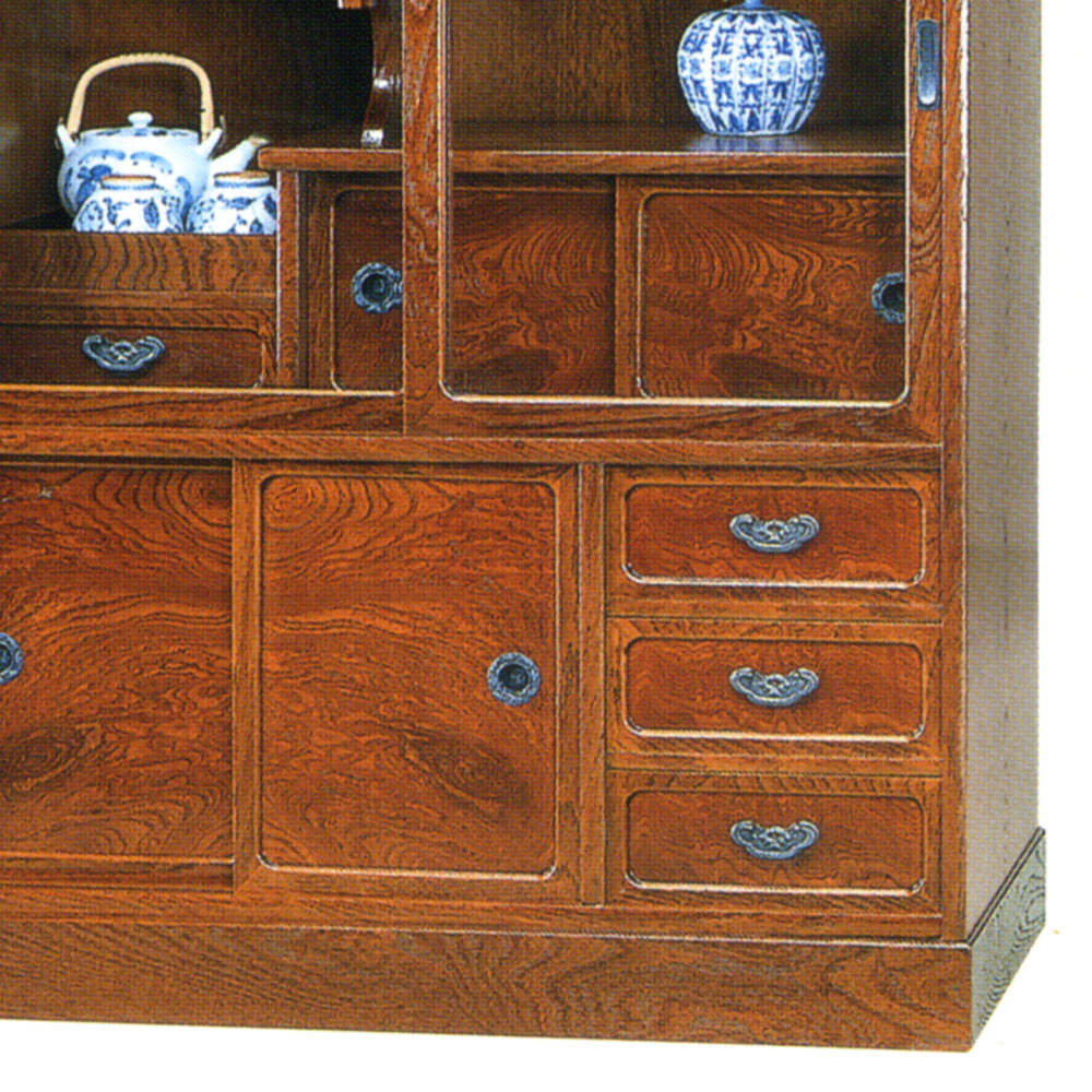 ケヤキ材の綺麗な木目を生かし、匠の技が、光る逸品です。こちらの和茶棚は、ケヤキの天然杢を使用した台輪を付けたバランス良い和茶棚です。店長コメント