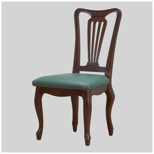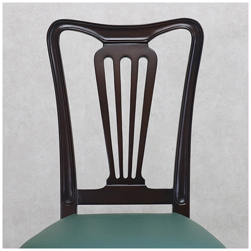 ソファー・ダイニングチェアの脚やキャビネットの扉の表面などには彫刻で仕上げたリブ(浮き上がる彫刻)が施されています。あくまでもシンプルに、大げさにならないようにしたこの木製の模様はさりげないデザインポイントとなっています。また、天板の中心を囲むように施された突き板の化粧張りが優美さを表現しています。また、ガラスキャビネットに使われている木格子はチッペンデール様式の頃の中国建築に影響を受けた形が取り入れられています。