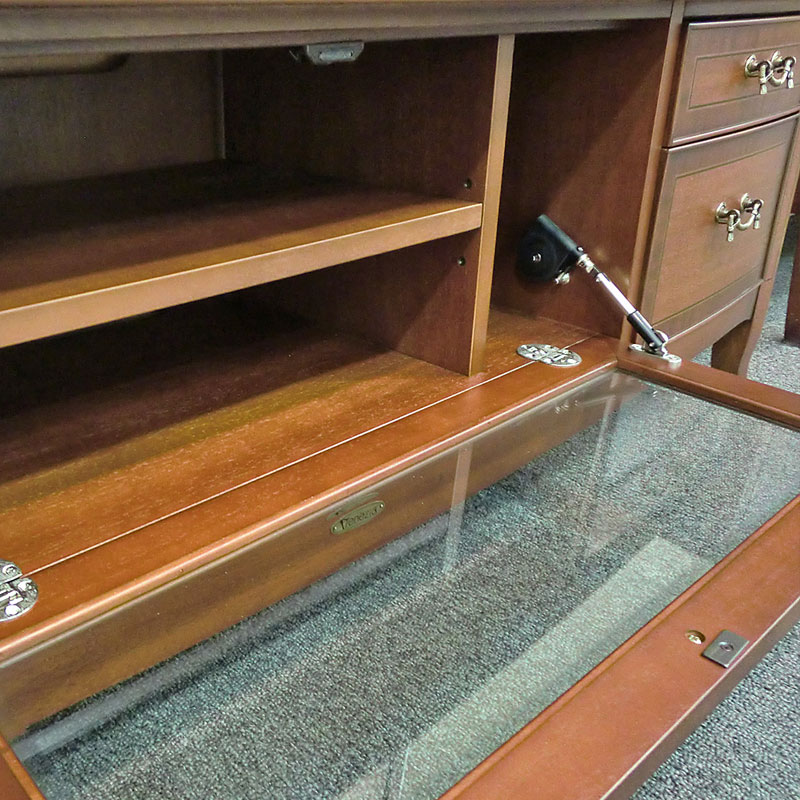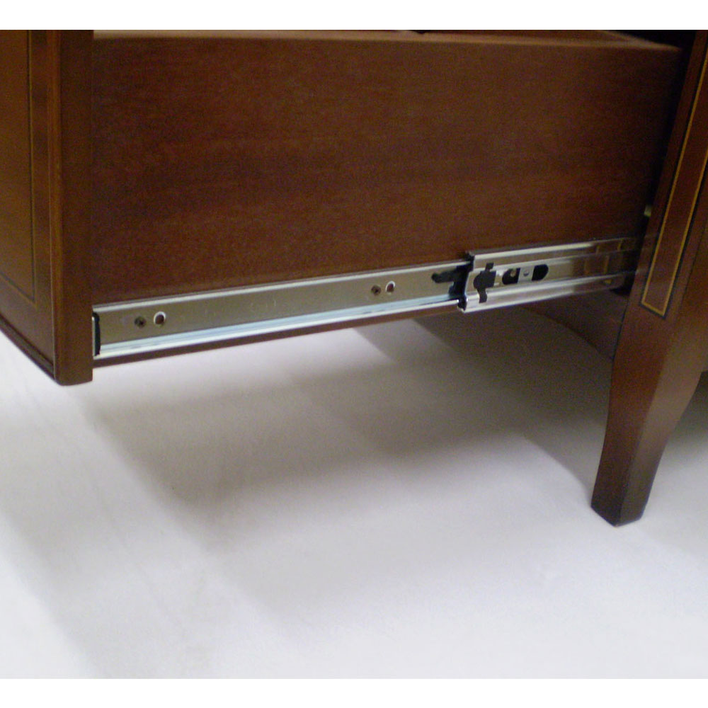 熟練の職人の手作業により、厚さ0.55ほどの単板(木をスライスしたもの)を模様に合わせて切り取り、表面を「焼き砂」焦がして影の表情を付け、丹念に貼り合わせて形にします。その飾りの本体の表面に埋め込んで、優美な模様に仕上げる細工でヨーロッパ家具の伝統ある技法を用いています。2.異種木目による模様貼り