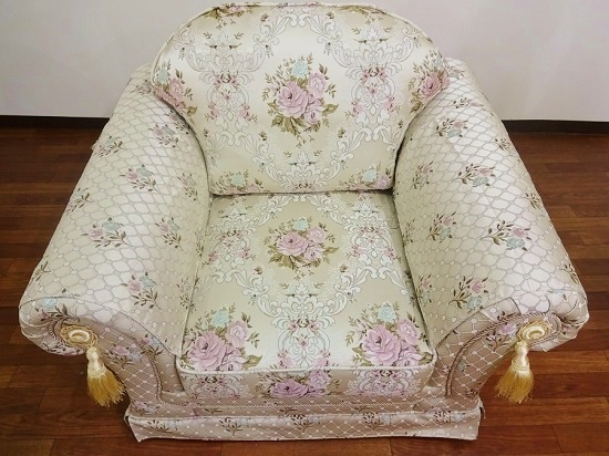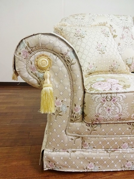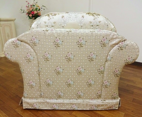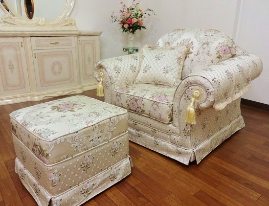 アームは、巻肘で美しい曲線に仕上げ。前面にはサテンロープ、裾は、スカートとイギリス王宮風のクラシックデザインの1人掛けソファー。