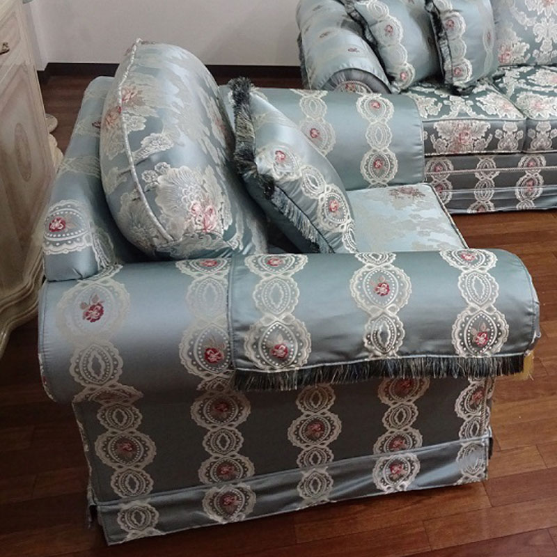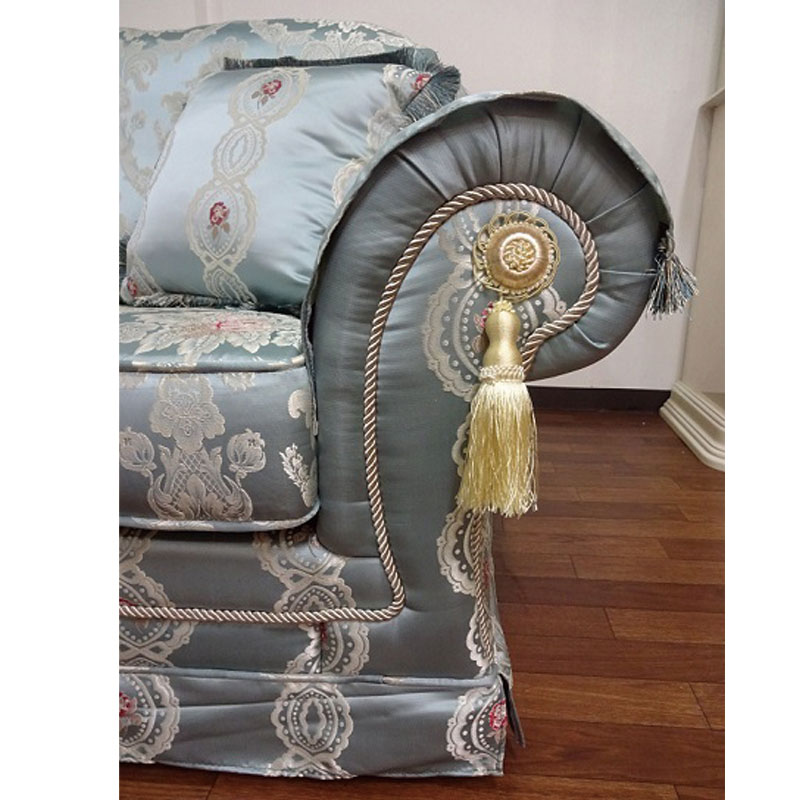 アームは、巻肘で美しい曲線に仕上げ。前面にはサテンロープ、裾は、スカートとイギリス王宮風の花柄のファブリックが素敵なクラシックデザインの1人掛けソファー。