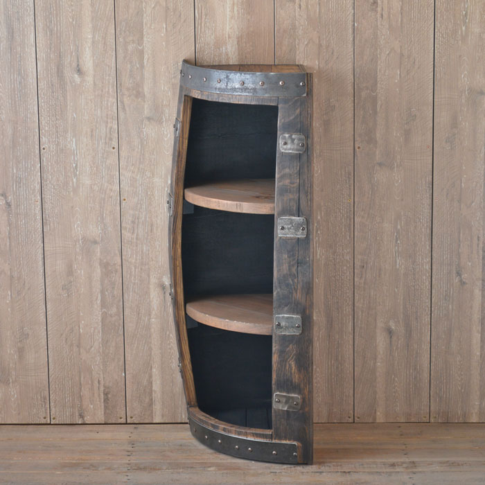 (北海道、九州、沖縄、離島等一部地域を除く) バレルコーナーラックは、ウイスキー樽を1/4カットの縦切し、正面をくりぬき、固定棚を2枚取り付けた雰囲気のあるウイスキー樽ラックです。