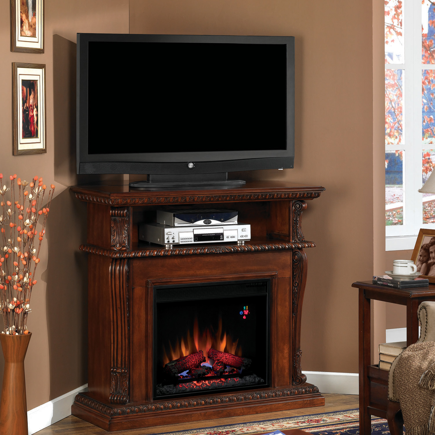 暖炉の本体上部にオープンスペースを配し、DVD機器などを置き、テレビボードとしても使用可能な革新的で機能的な電気式暖炉コリンス1000W。
