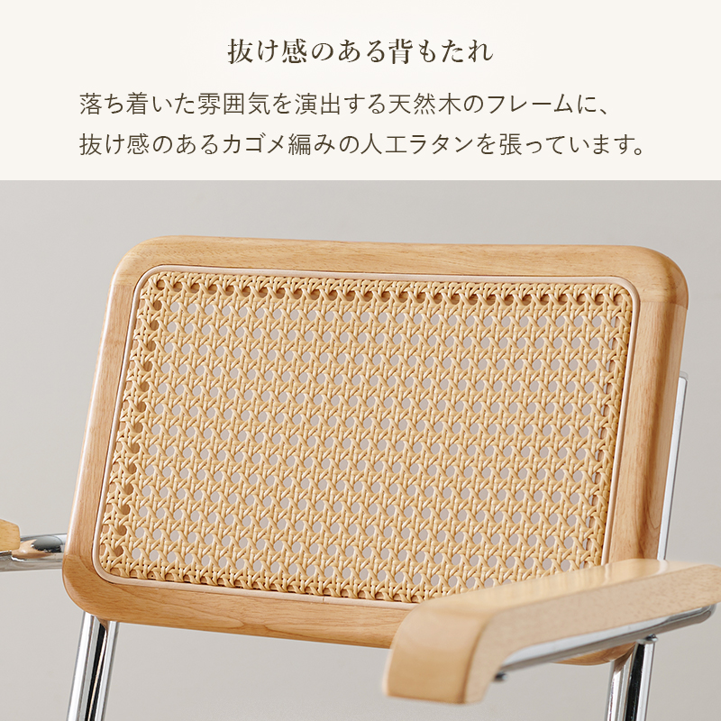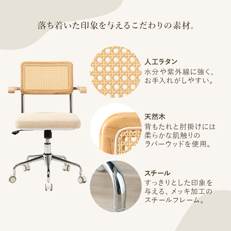 (北海道、沖縄、離島等一部地域を除く) 置くだけで自然な抜け感を演出するナチュラルテイストのラタン調オフィスチェア。肘掛け付き