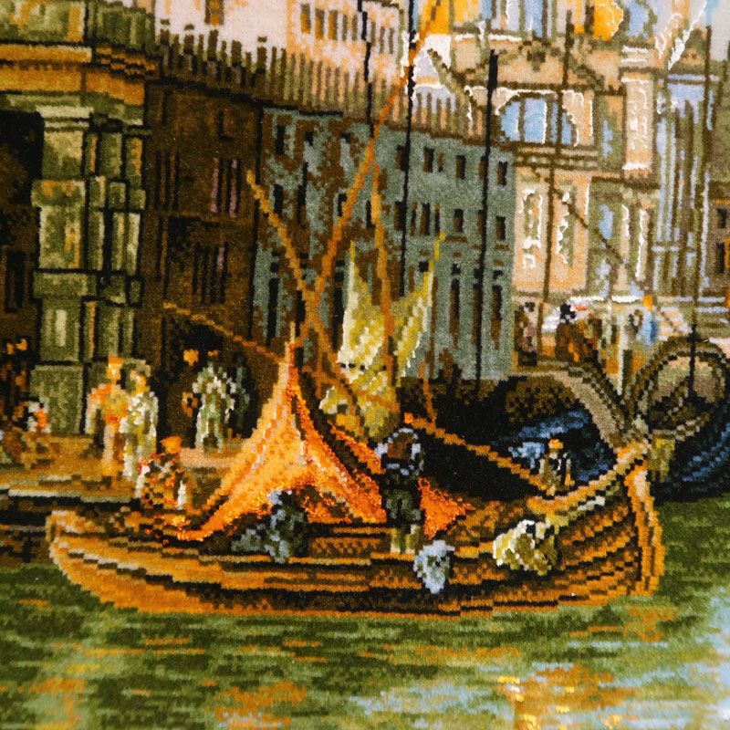 ウールとシルクで緻密に織られた手織りの絨毯の絵は、近くで見なければ油絵のようです。
