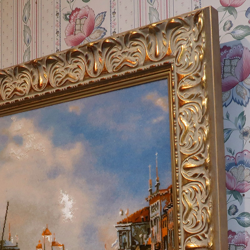 こちらの絨毯絵画は、絨毯は、イランの工房から直接仕入れ、額は、絨毯にあわせ国内で製作いたしました。額の製作は、国内有数の油絵額専門の工房です。