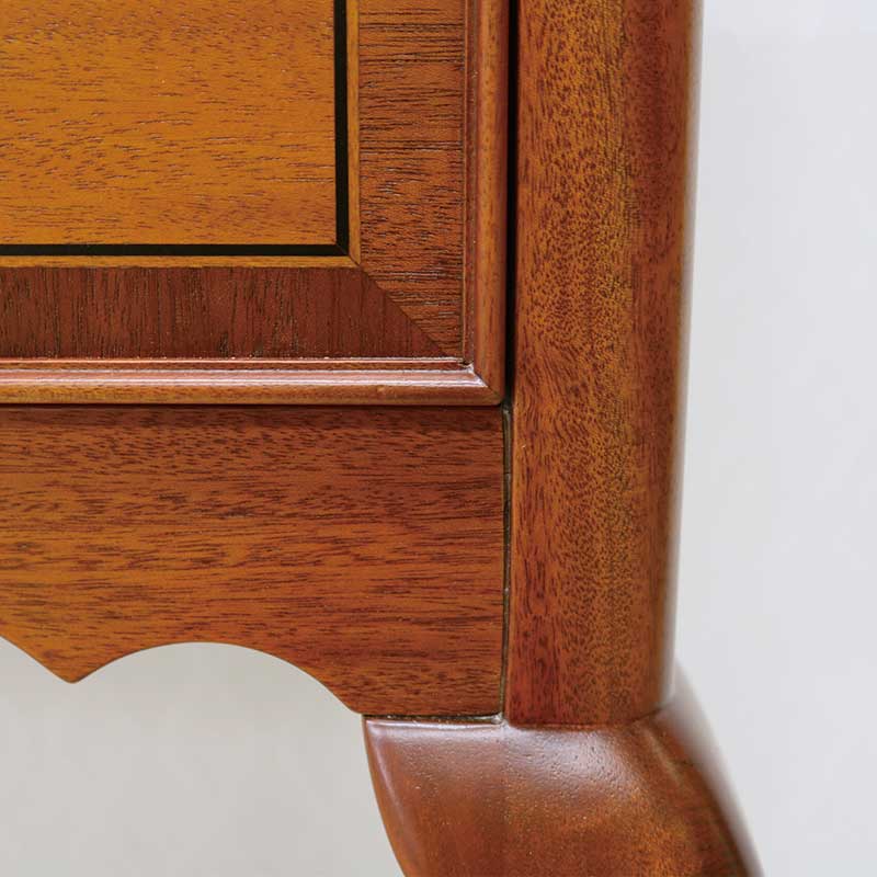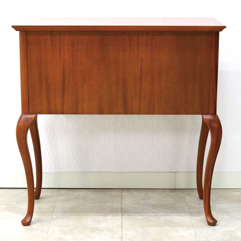 天板上面と引出し前板にマホガニー柾目とサペリ柾目の突板模様貼りをアクセントにした、英国の格調高いクィーンアンスタイルのコンソールです。