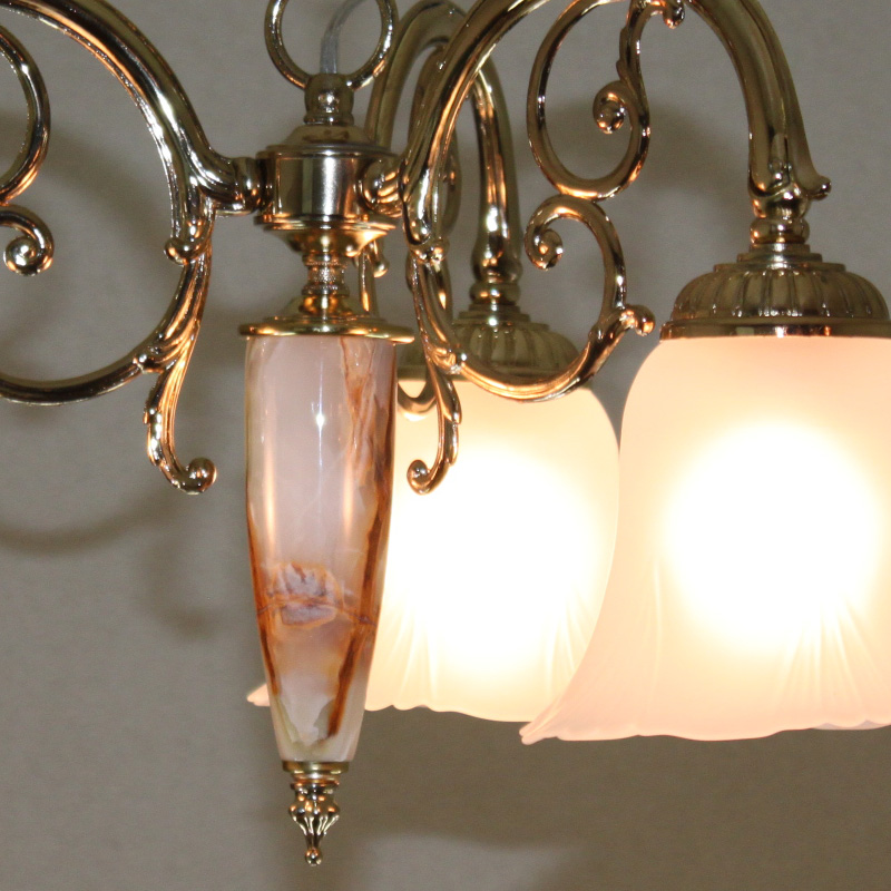 (一部地域除く)アンティークゴールドメッキの本体に天然クリーンオニクスの飾りをつけ重厚感のあるスタイルのスペイン製のオニクスで装飾された3灯シャンデリアC型です。