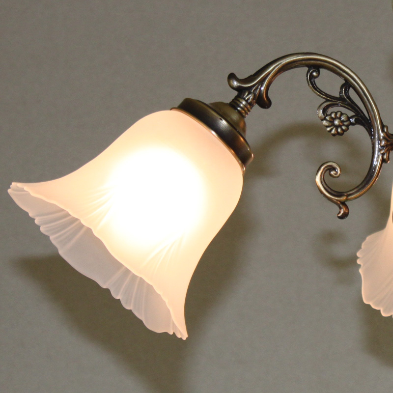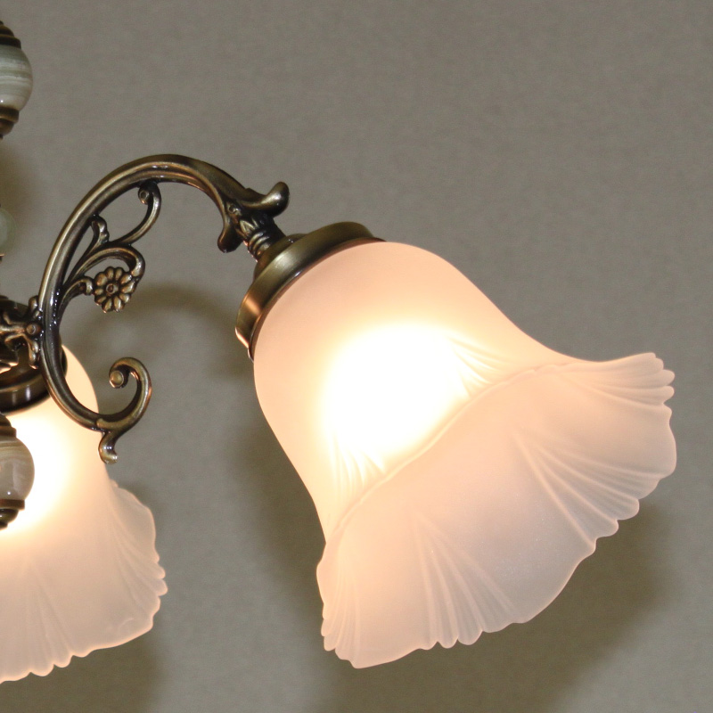 (一部地域除く)古美色メッキの本体を天然グリーンオニクスで装飾し、フロスト部とクリア部をハイブリッドしたセードを採用し、エレガントな印象の3灯シャンデリアE型。