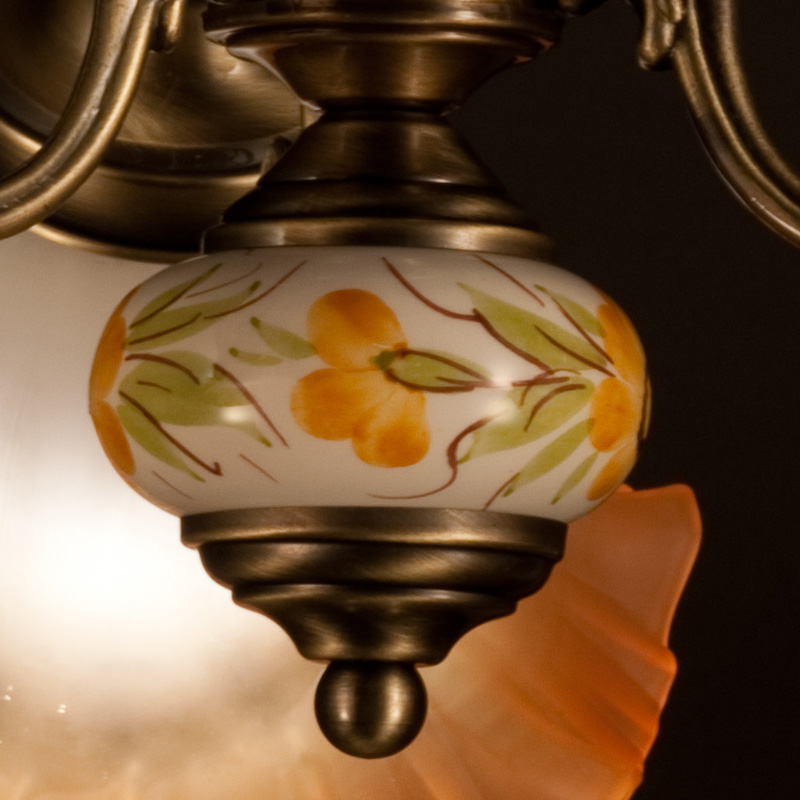 緑にオレンジ色の塗装を施した華やかなガラスを採用したスペイン製の手書きの陶器で装飾された3灯シャンデリア。