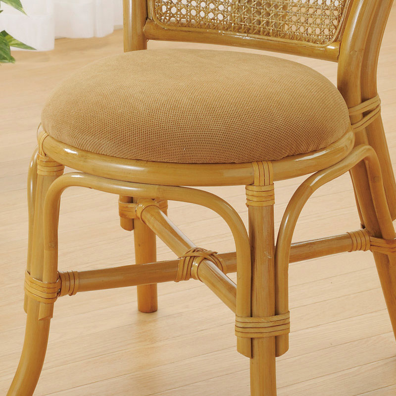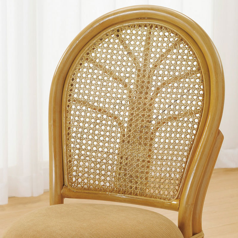 肌触りがとてもよい高級ファブリックを張った籐ダイニングチェアです。巻き部分には、丈夫な本革ピールを使用しています。