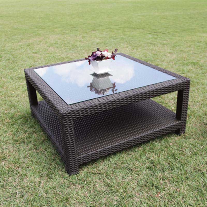 モダンなデザインの人工ラタンで作ったガラスエンドテーブル。フレームは、アルミで軽量のため、移動もラクラク。