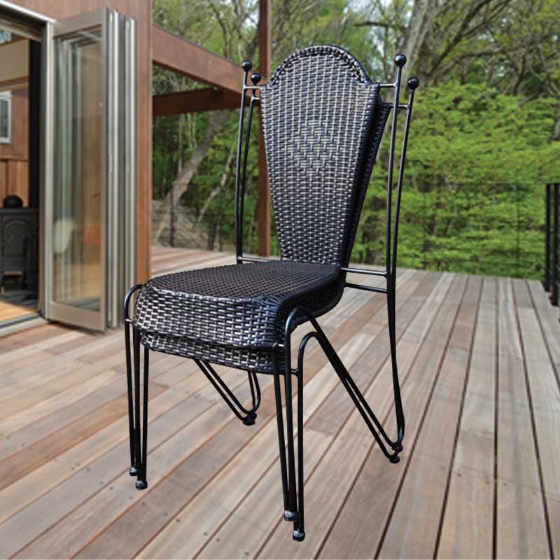 アイアンフレームに人工ラタンを巻き付けたおしゃれなチェア。収納に便利なスタッキング。