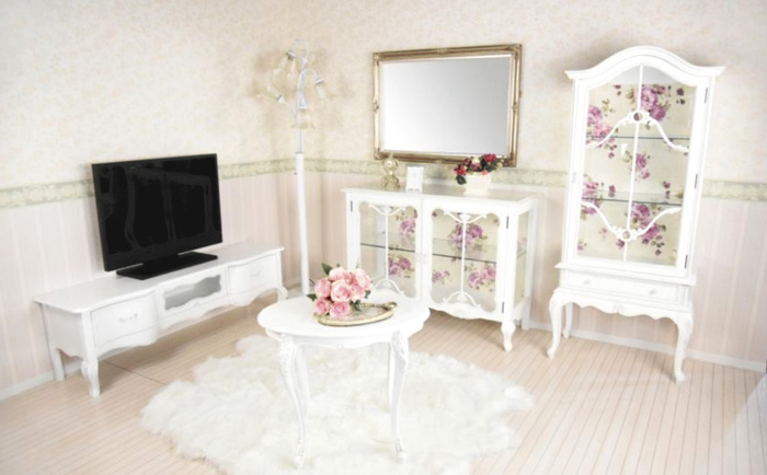 猫脚のアンティークホワイト色の質感を感じる上質なスカーレットシリーズのイタリアンコーヒーテーブルです。手彫りの彫刻がさらに上質感をアップさせています。。