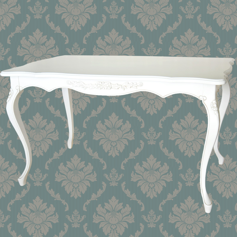 猫脚のアンティークホワイト色の質感を感じる上質なスカーレットシリーズの130cm幅角型猫脚イタリアンダイニングテーブル5点セットです。