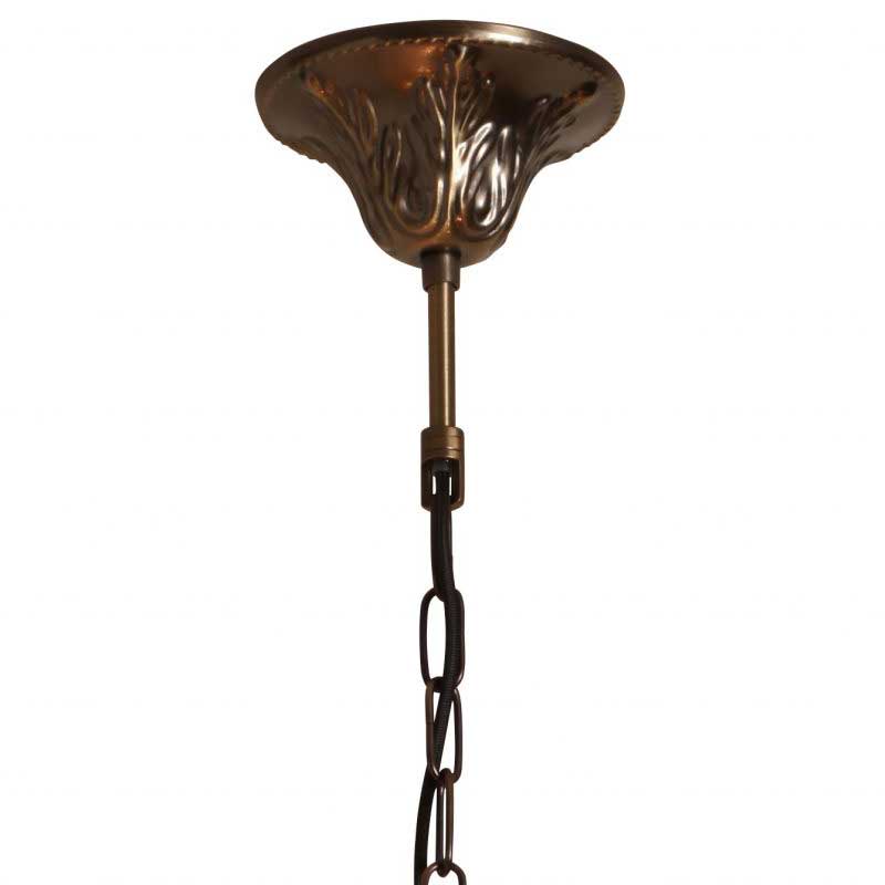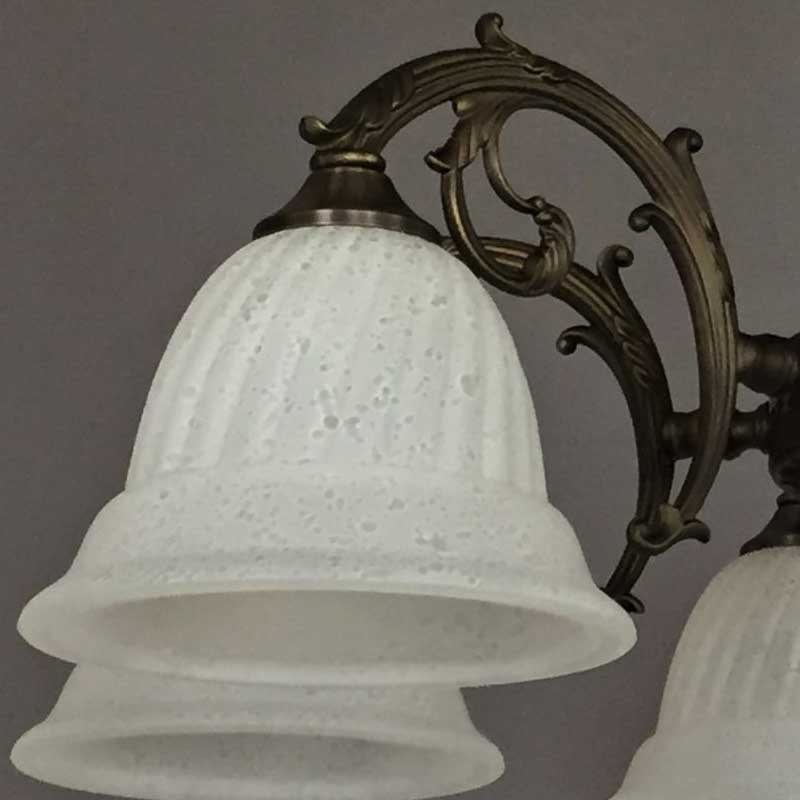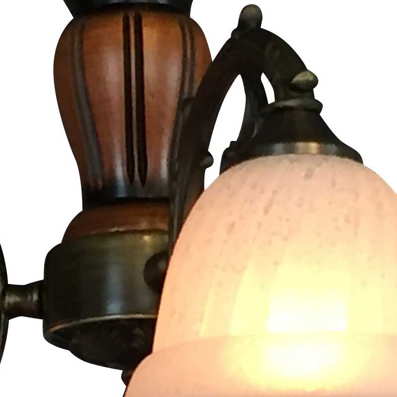 本体の装飾にはイタリア産の木を使用した3灯シャンデリア。イタリア製の柄入りのガラスは点灯時に和らかな雰囲気をつくり出します。