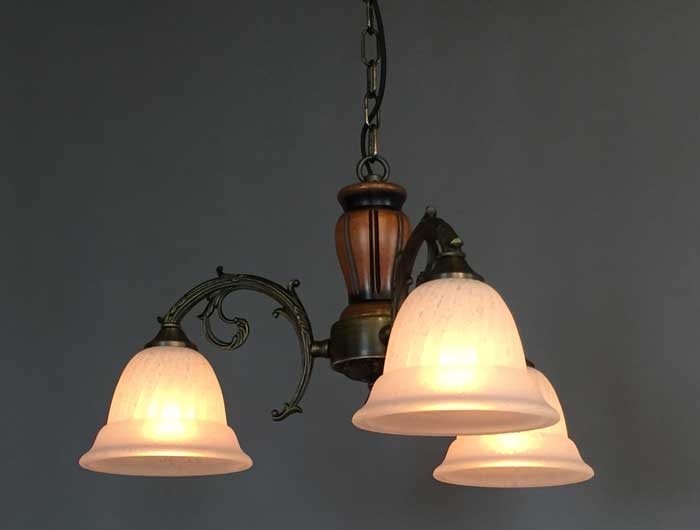 鋳物と天然木のコンビネーション3灯シャンデリア照明 イタリア製ガラス