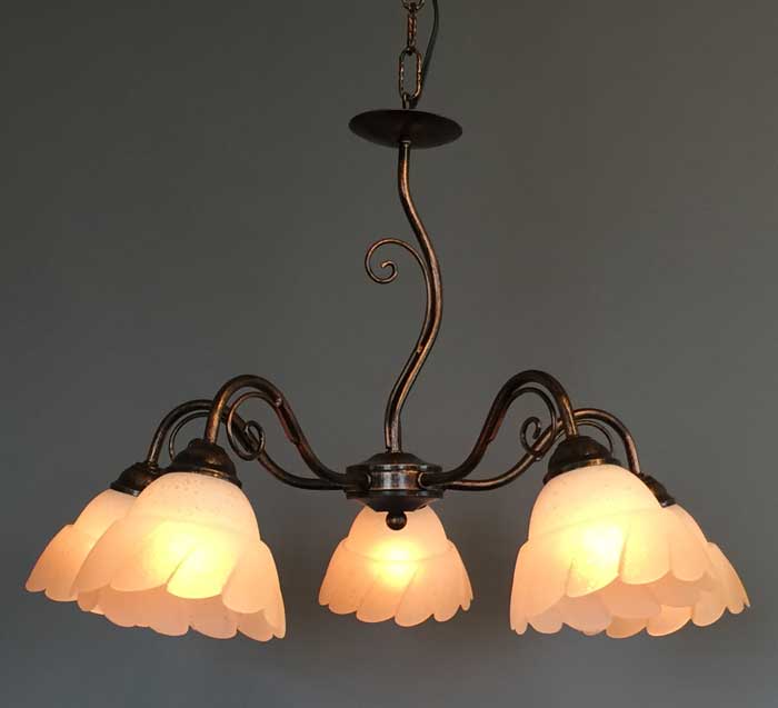 アイアンワークが最も特徴的なイタリアのアイアン5灯ガラスシェードシャンデリア照明です。イタリアらしい細工の入ったガラスシェードが雰囲気を柔らかいものにしています。
