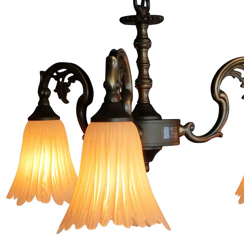 イタリア製のガラスを使用した3灯シャンデリア。縦ラインの模様の入ったアンバー色のガラスは点灯時には暖色の柔らかい灯りを演出いたします。
